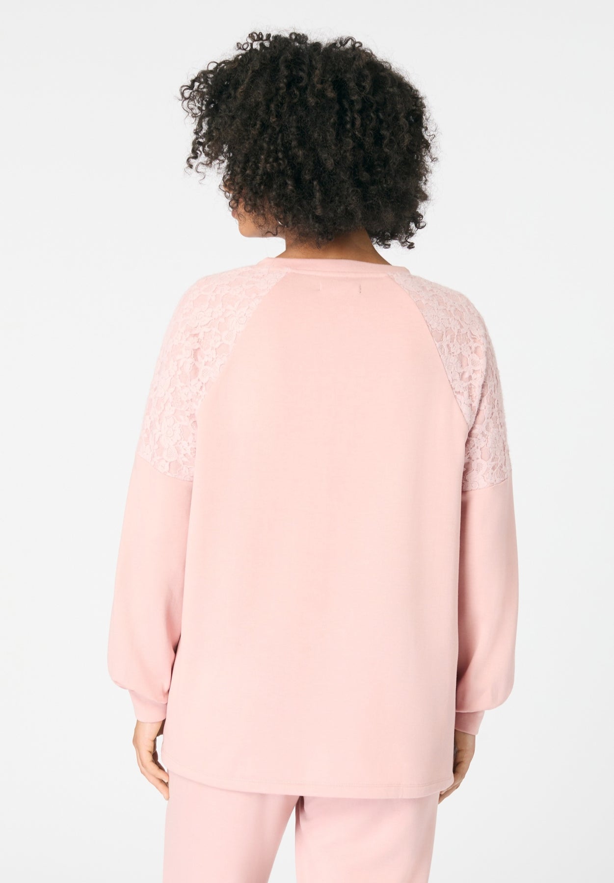 This cozy sweatshirt features a crew neckline, raglan long sleeves with soft elastic at the hem, and a stylish lace shoulder insert for a touch of femininity. Made from buttery-soft jersey, it offers a comfortable, flattering A-line silhouette and a sleek straight hem.