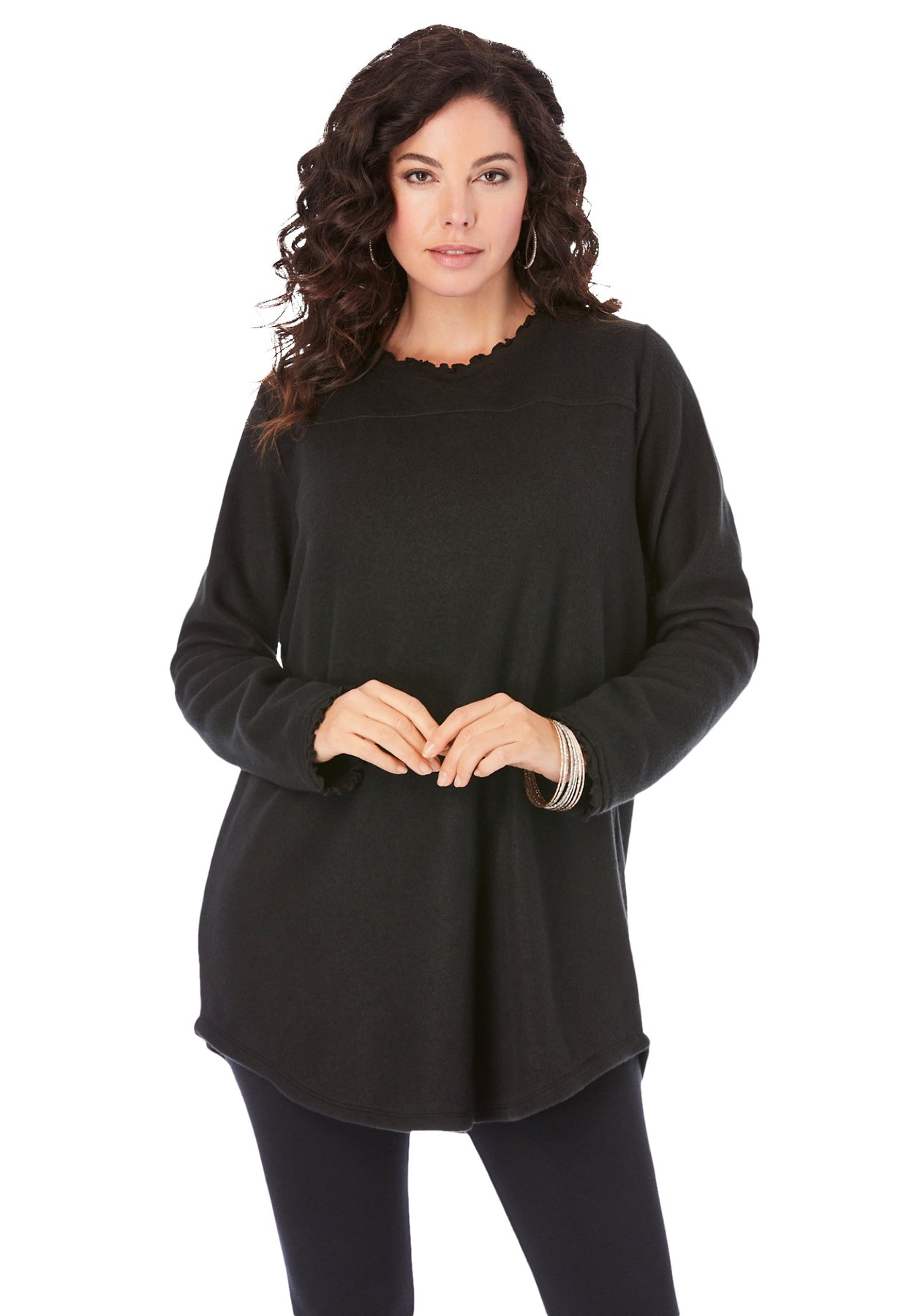 This supersoft and cozy tunic is one you'll reach for all season. Detailed with feminine touches like a ruffled neckline and cuffs.
