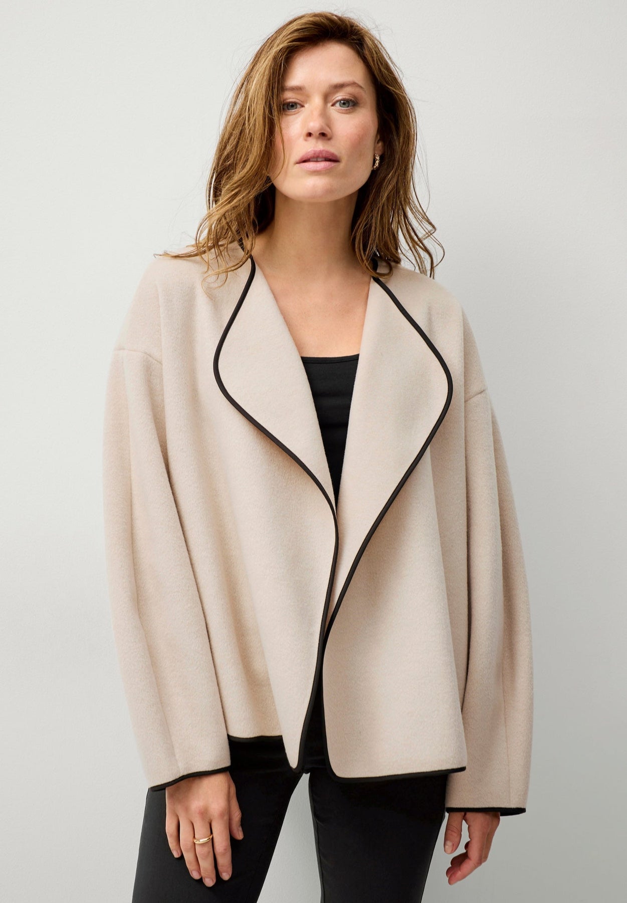 It’s easy to always feel put-together and sophisticated in this drapey jacket. Features a flattering, open-front fit and detailed with piping trim on the sleeves and neckline.