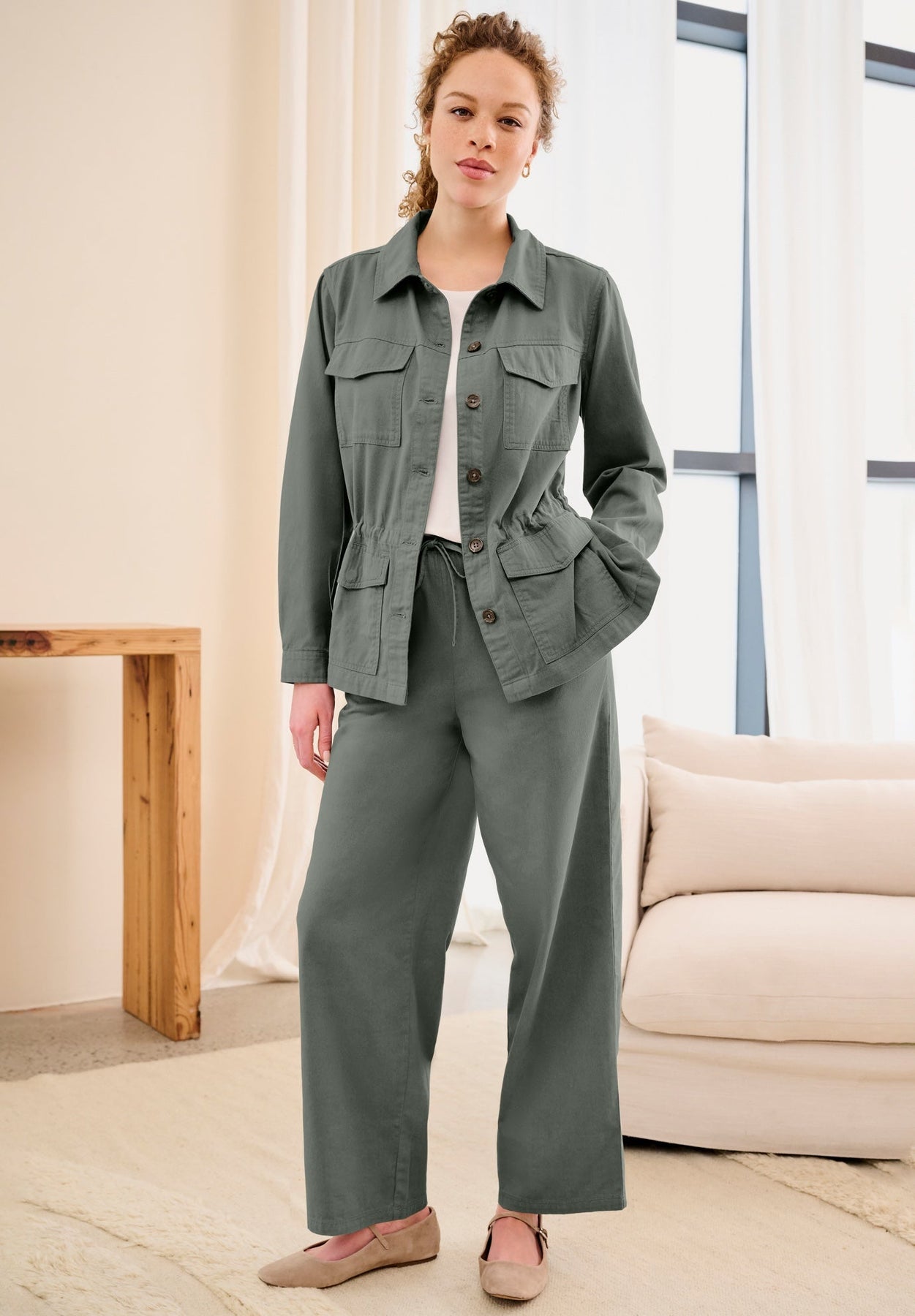 Meet your new favorite casual jacket. Ellos' plus size women's button-front jacket is veratile and on-trend. With its utility-inspired design, it's the perfect light twill layer for transitioning seasons in style. Style it with the coordinating Drapey Wide Leg Pant for a head-to-toe look made for spring.