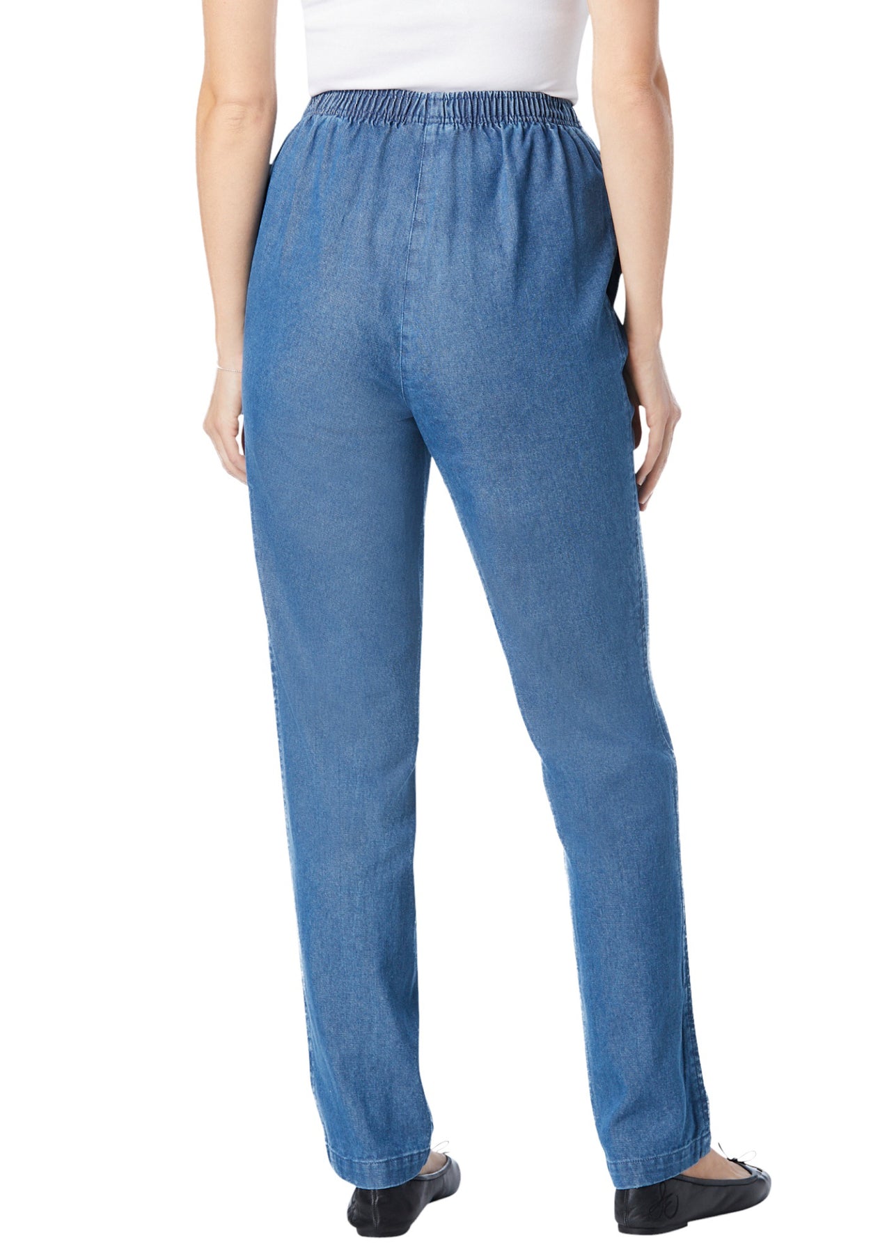 Woman Within Women’s Plus Size 7-Day Straight-Leg Denim Jeans are designed for the fit you’ve been looking for—easy, secure, and made to move with you. Crafted with soft denim, they hold their shape while delivering all-day comfort. The pull-on design with a full elastic waistband creates a smooth, gap-free fit (no digging, no gaping), while the faux fly and functional pockets keep the classic jean look you love. Available in average, petite, and tall lengths so you get a truly customized feel.
