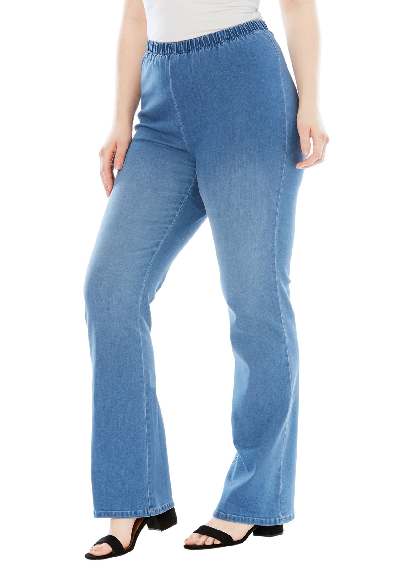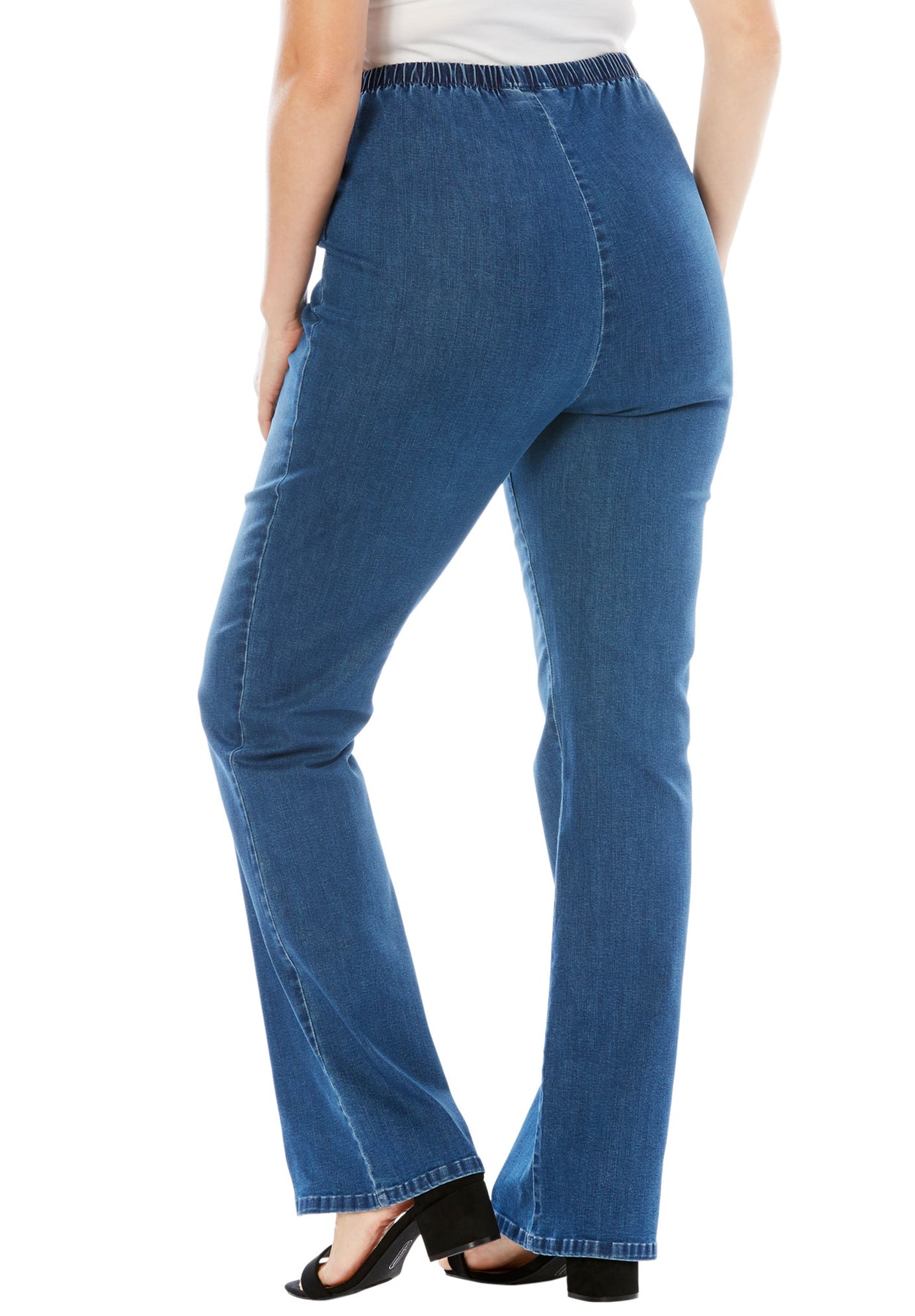 Classic with plenty of added stretch, these bootcut jeans lengthen your legs with a subtle flare that makes them easy to style with. Try a timeless look with a knit sweater and booties, or go bold with a statement blouse and low heels. No pockets for a smooth look.