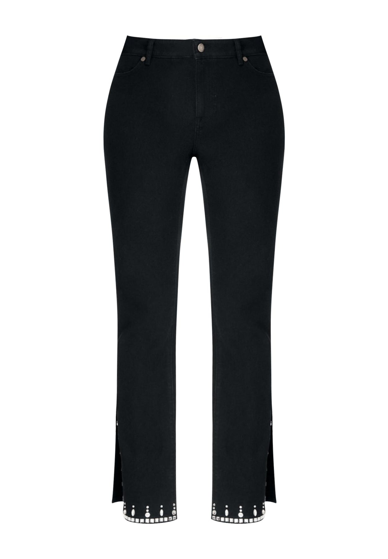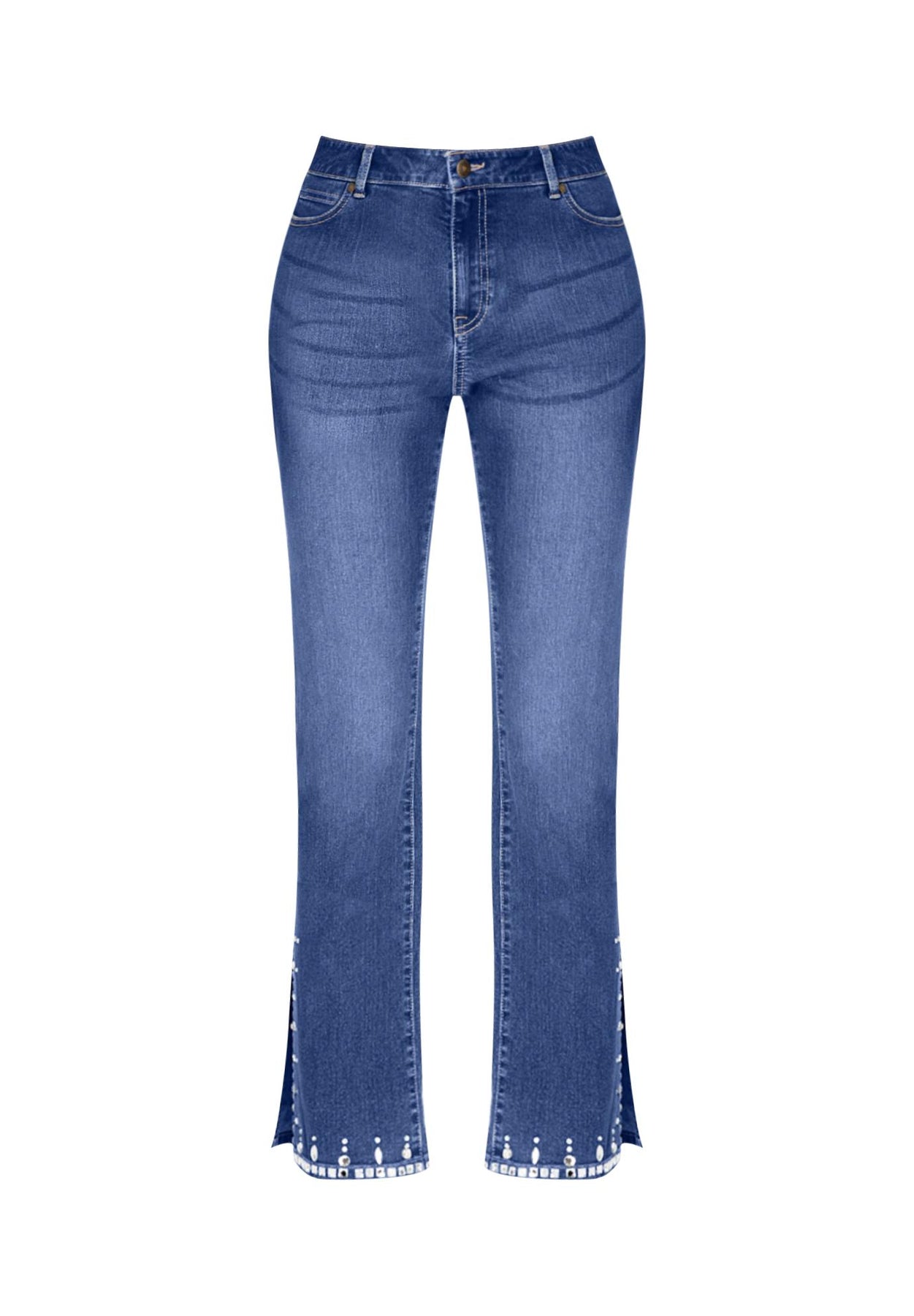 Defined by a flared silhouette with splits on the side, these 70's-inspired jeans is detailed with rhinestone embellishments—to give this pair an elevated feel. Button-fly waistband. Five-pocket styling.