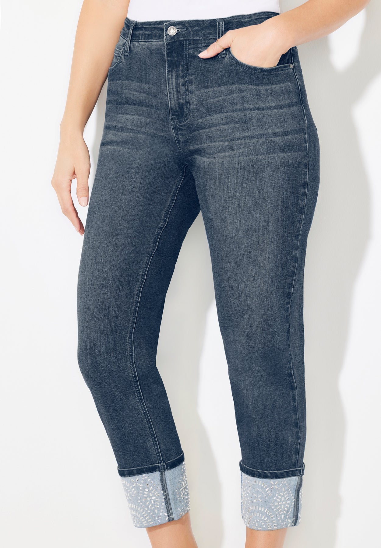 It's the fashion jean you've been asking for! Crafted from smooth stretch denim in cool washes, this jean really shines thanks to shimmering details at the cuffed ankle. Pair it with any of our fashion tops, sweaters and cardigans.