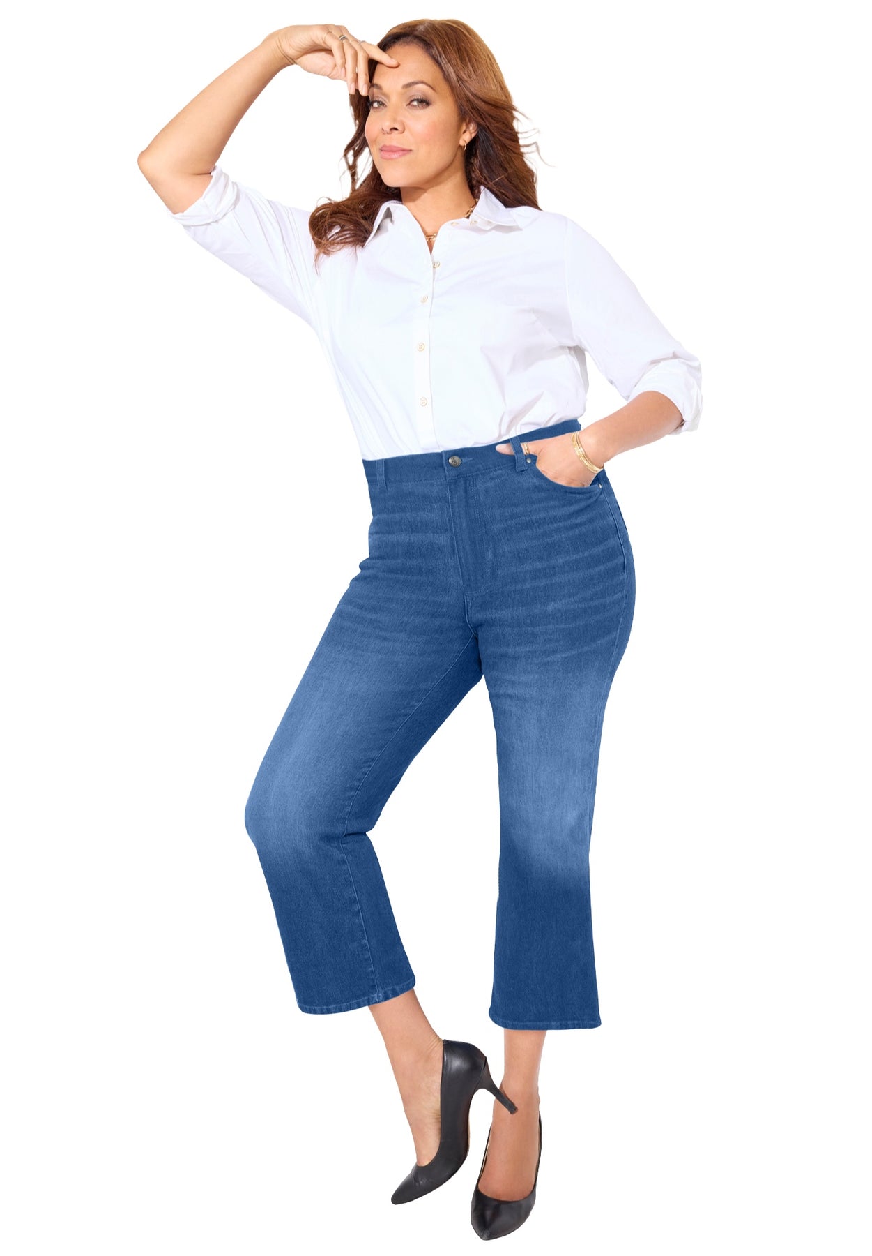 A timeless classic just got chic. Our Right Fit® heritage jean — now in the of-the-moment cropped cut — designed in our Moderately Curvy fit, the slimming favorite for those who are slightly curvy from waist to hip. Featuring comfortable stretch with a classic 5-pocket design and a straight leg. Pair with a tank or tee for a casual look or throw on our Right Fit® Blazer and a heel to elevate the mood.