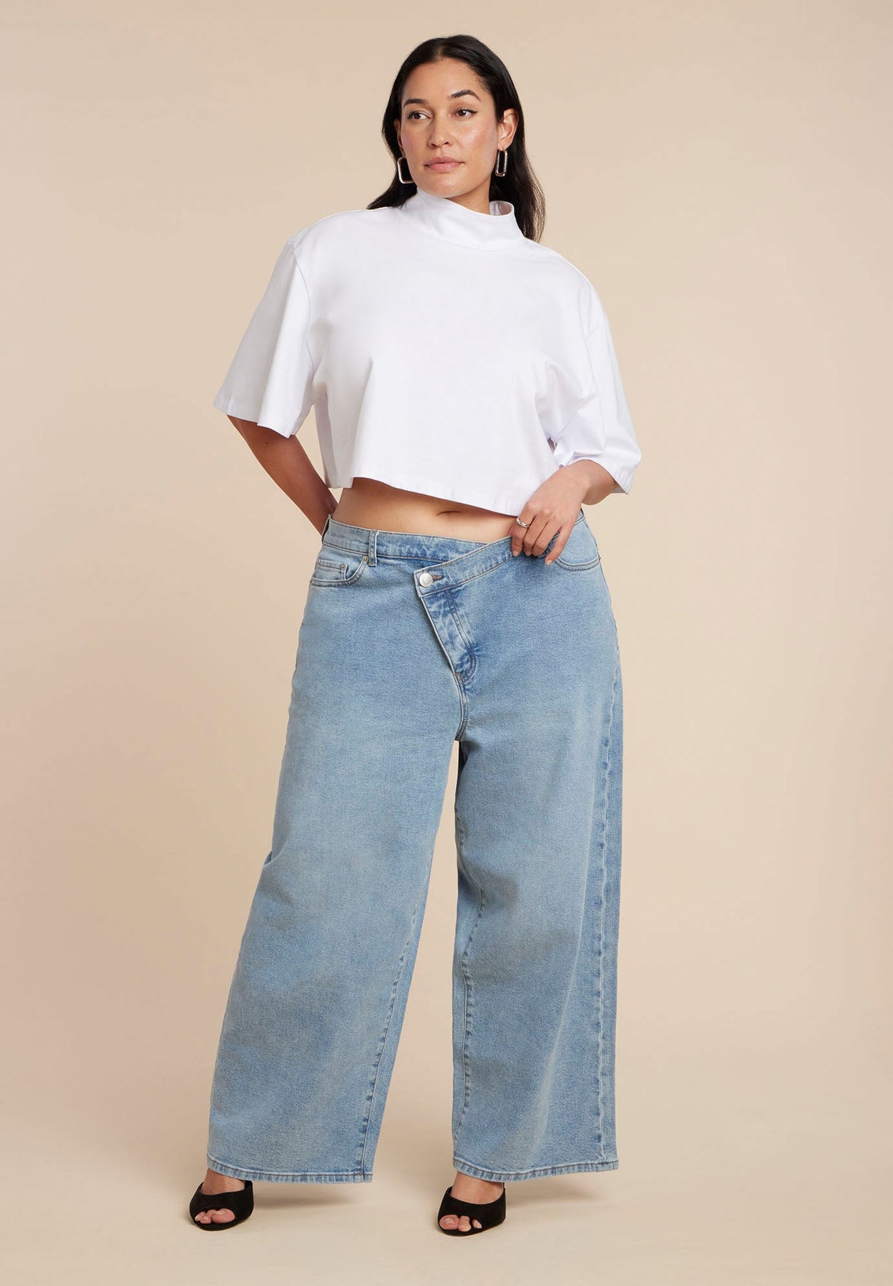 An overlapping waistband sharpens the silhouette of these wide-leg jeans, making them a trend-right upgrade to your favorite pair. With a high rise, comfort pockets, & slight stretch, they honor trend and comfort in equal measure.