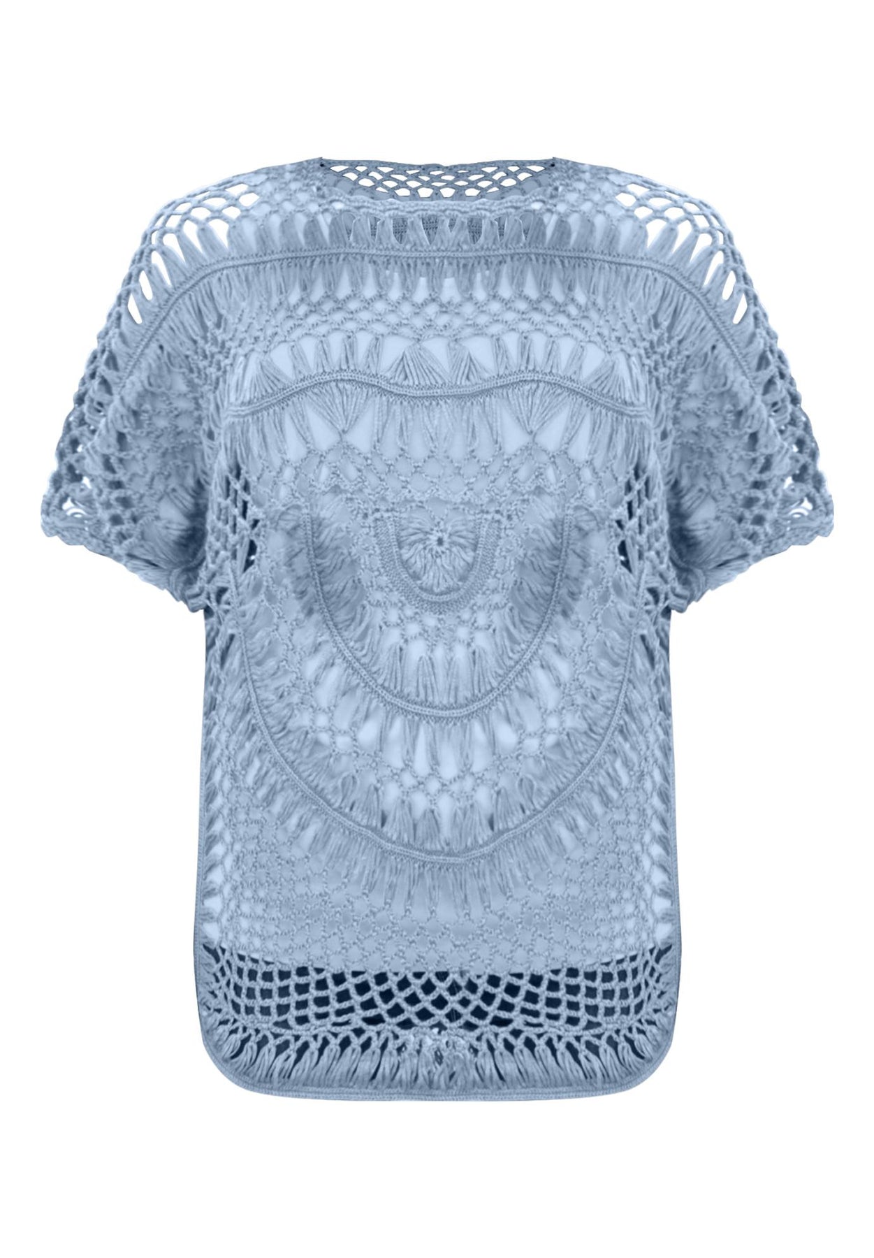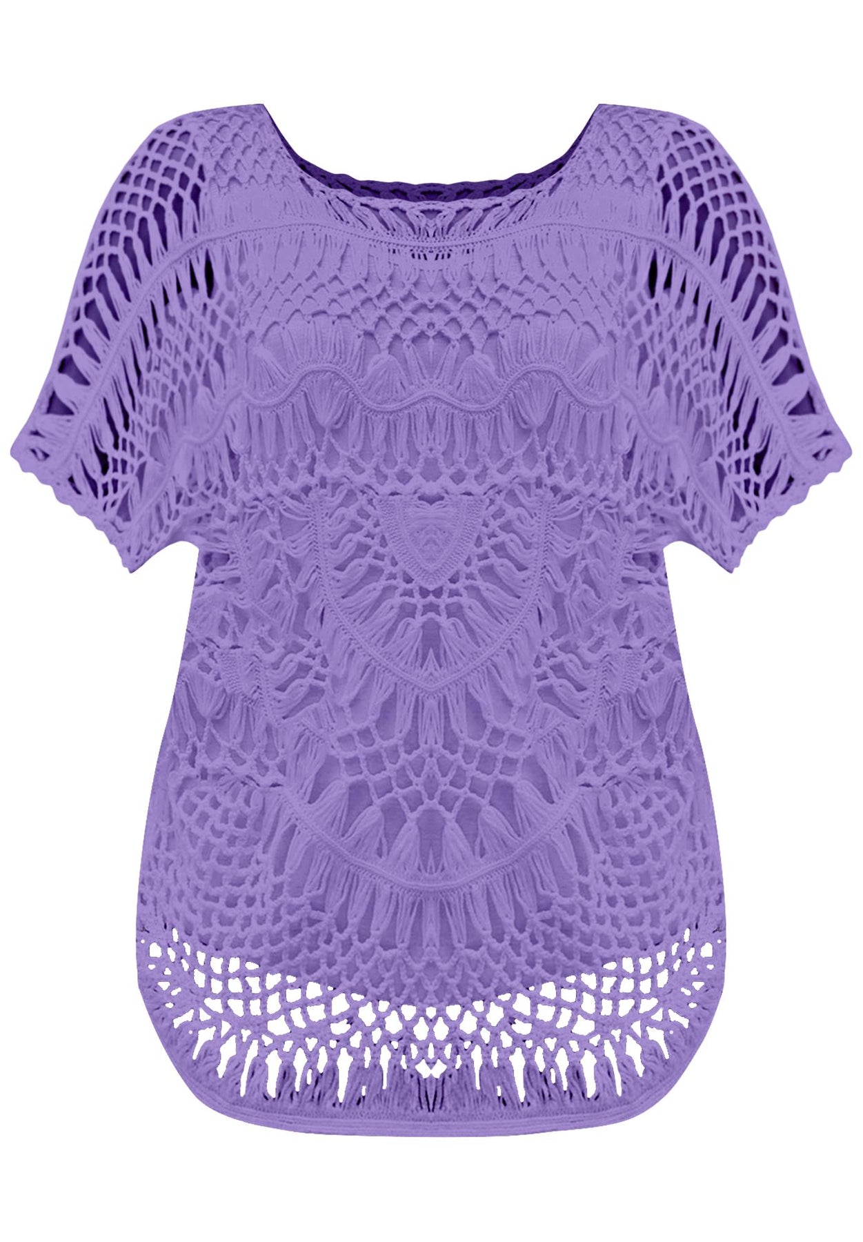 The open hand crochet stitch work and flattering fit will have you reaching for this sweater again and again. Pullover style, short batwing sleeves, rounded hem.