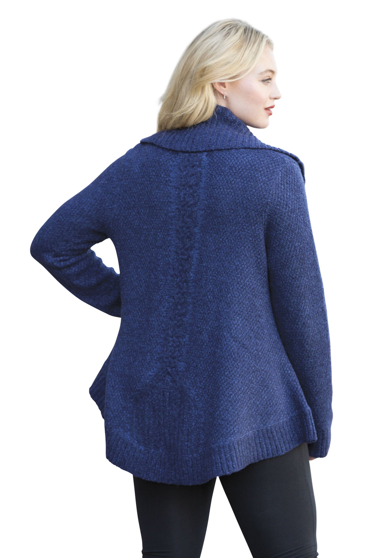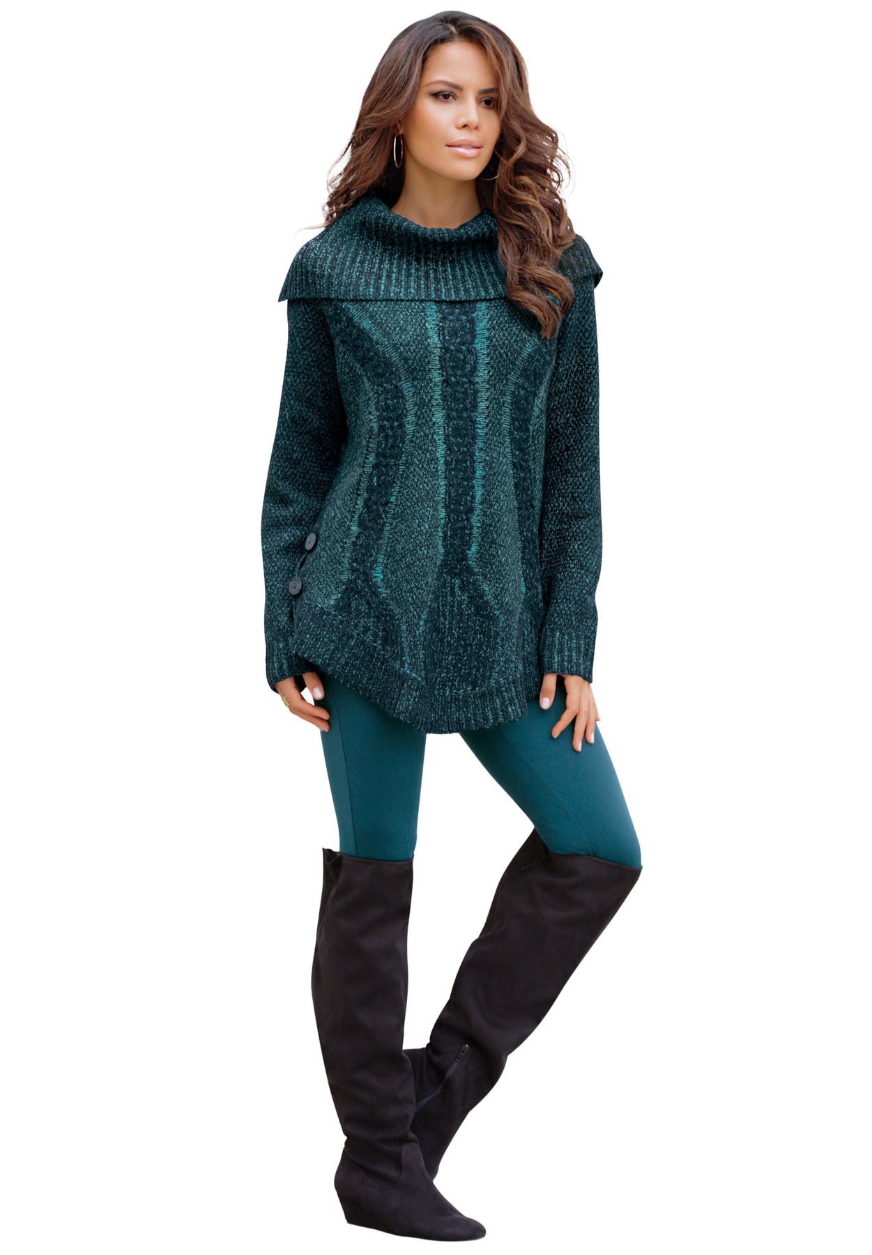 This cute cable knit pullover with a cowl neck and a swing silhouette will be a favorite for years to come. Curl up with leggings for an easy look. Side button detail. Curved hem in the front and back.