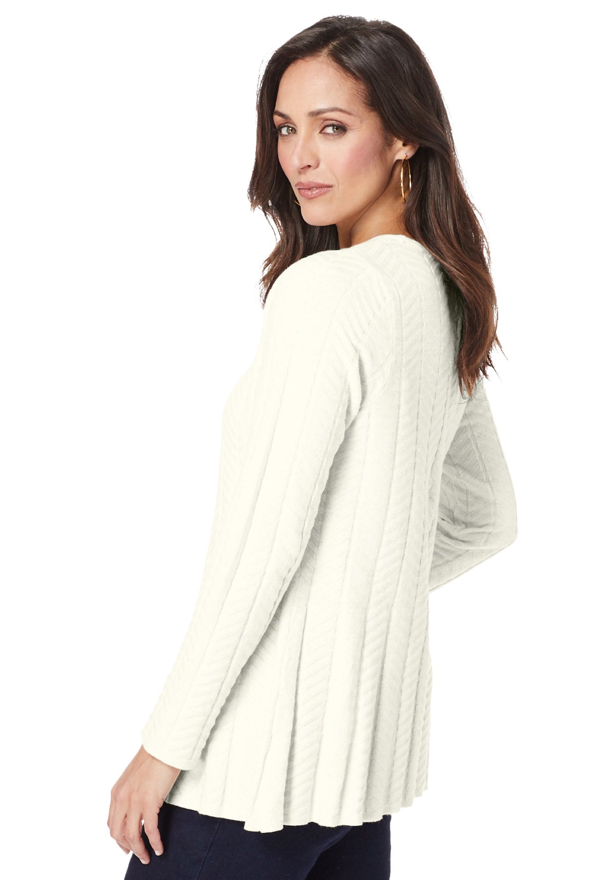 A fabulous fit & flare silhouette and textural cable knit detail gives this sweater a casual-chic look that you will love. The scoop neckline is perfectly proportioned to smartly conceal bra straps and the slight peplum-shape offers a breezy feel that eases over everything in your fall-forward wardrobe. Just add booties and your favorite accessories!