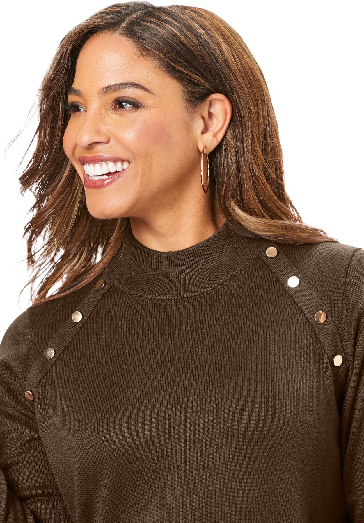 Add a touch of cozy to your winter look with this gold-button accented sweater. Pair it with jeans or trousers, it works!