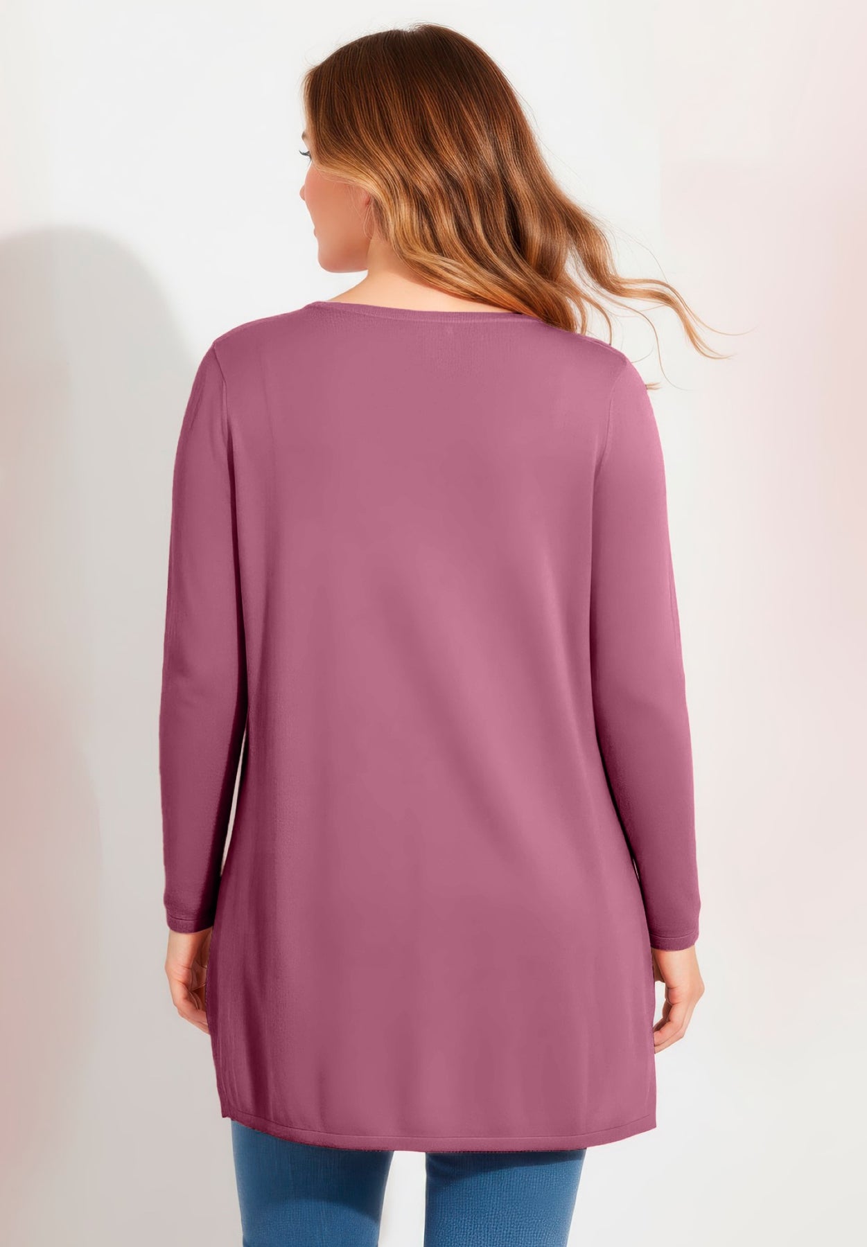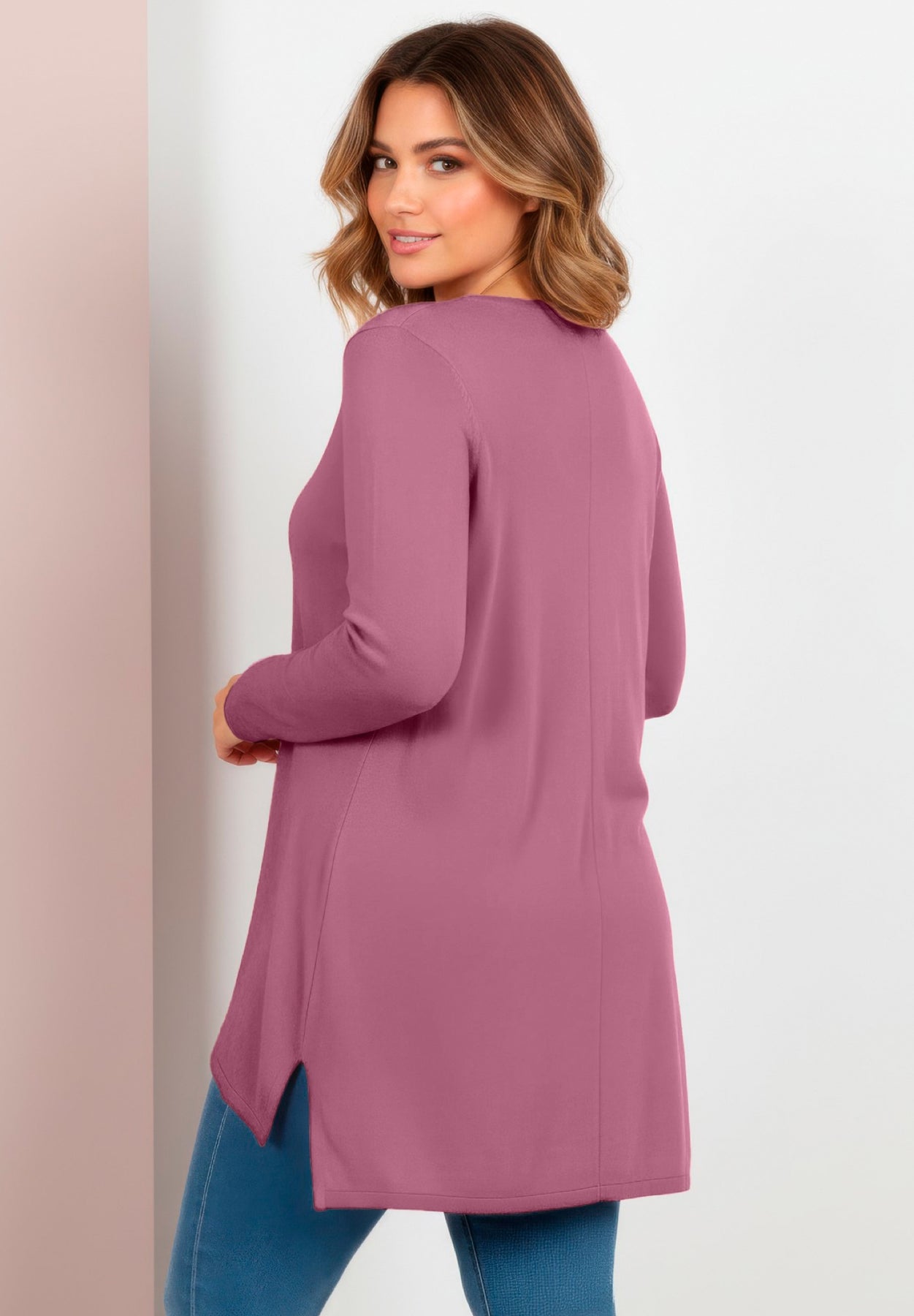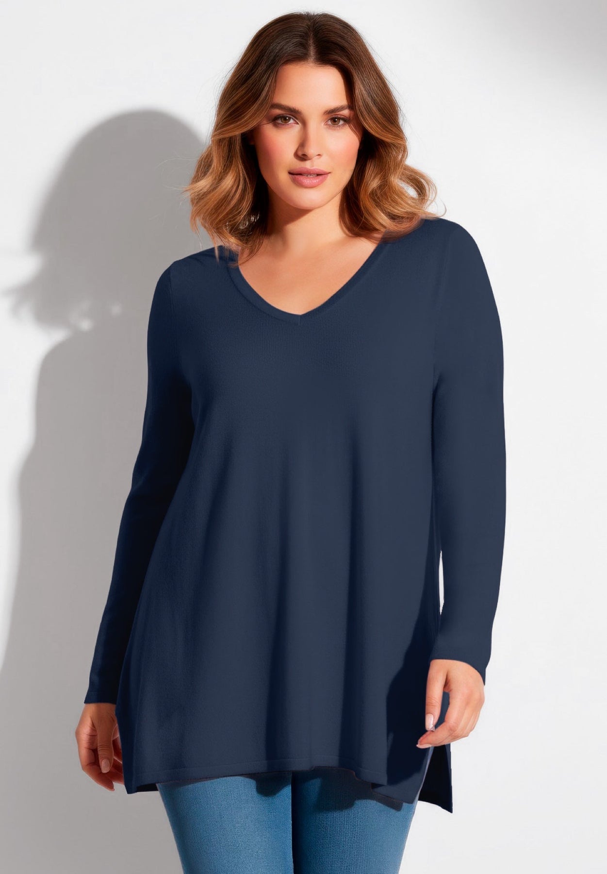 FIT: Relaxed V-neck sweater with slightly longer length in the back. Long sleeves. 4” side slits.