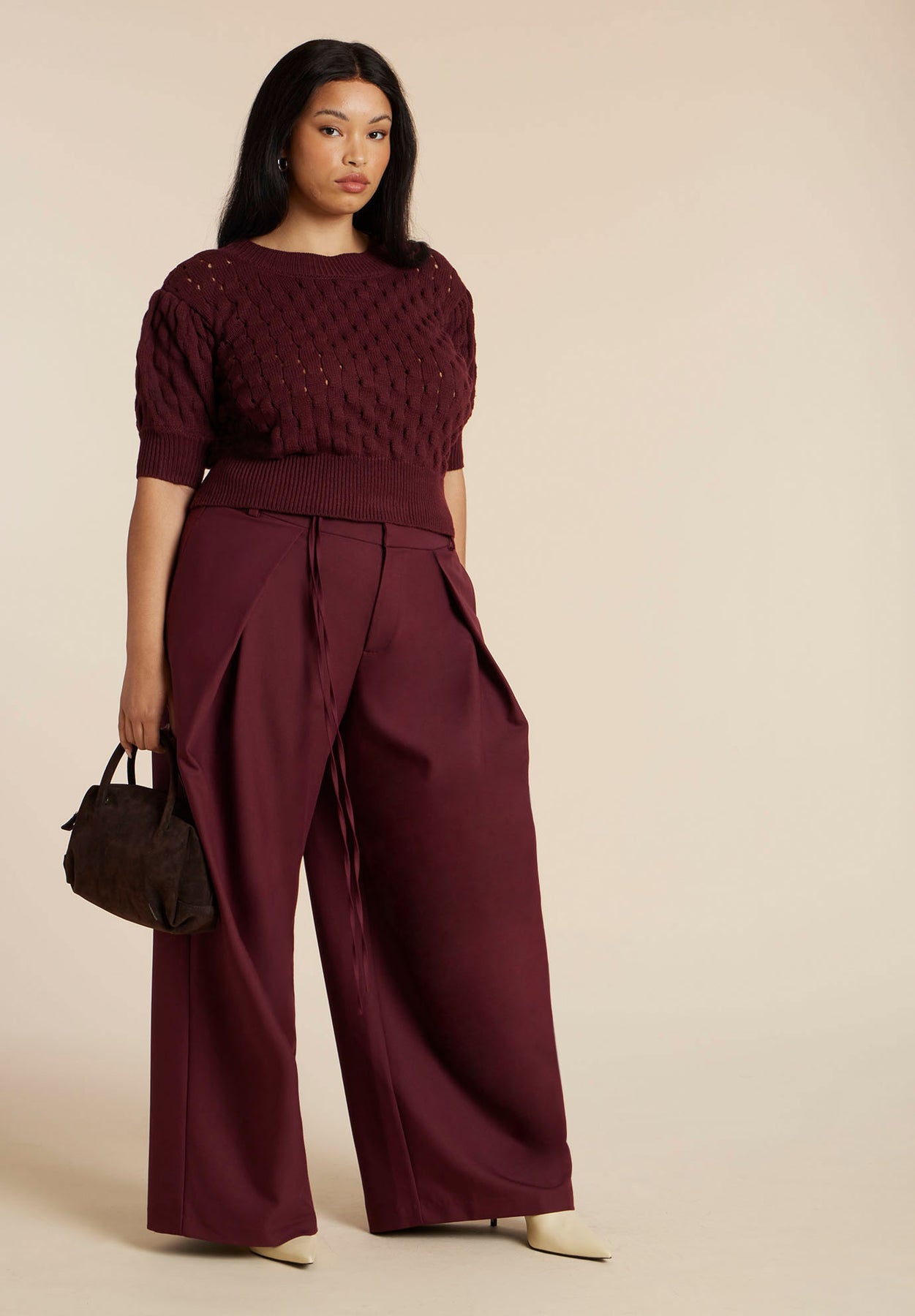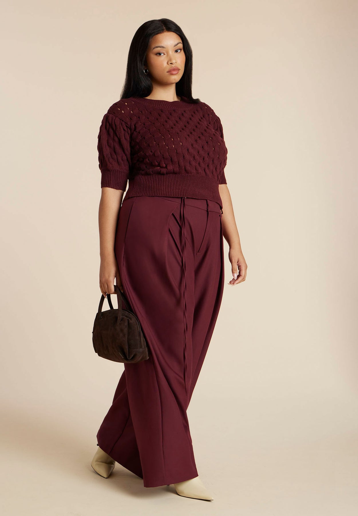 Cut to hit high on the waist, this knit top is playfully finished with puff sleeves and bubble-stitched texture that invites a closer look.