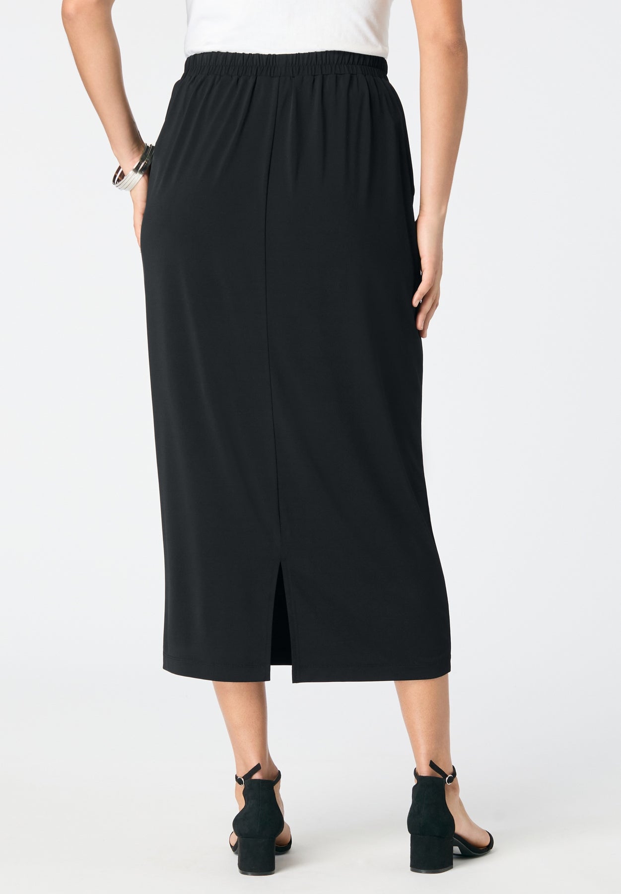 This midi skirt combines comfort and style with a flat waistband, a slightly extended fit, and a flattering back slit that's been lengthened for added elegance. It provides the perfect balance of both style and flexibility for any occasion.