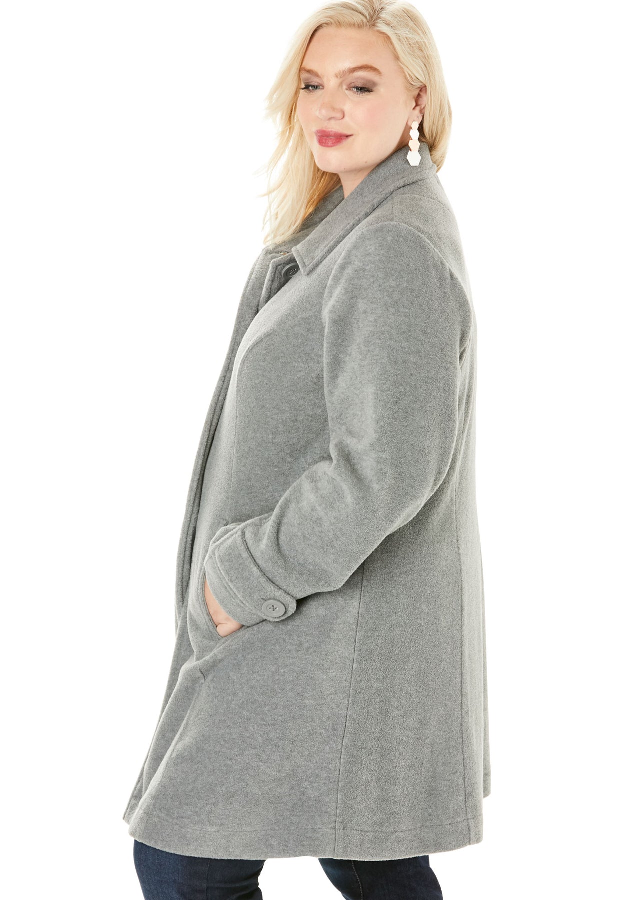 Fleece gets fashionable in this cozy jacket with an A-line silhouette and classic button front. Designed to warm up your style all season long, with princess seams, button tabs at the cuffs and on-seam pockets. Unlined.