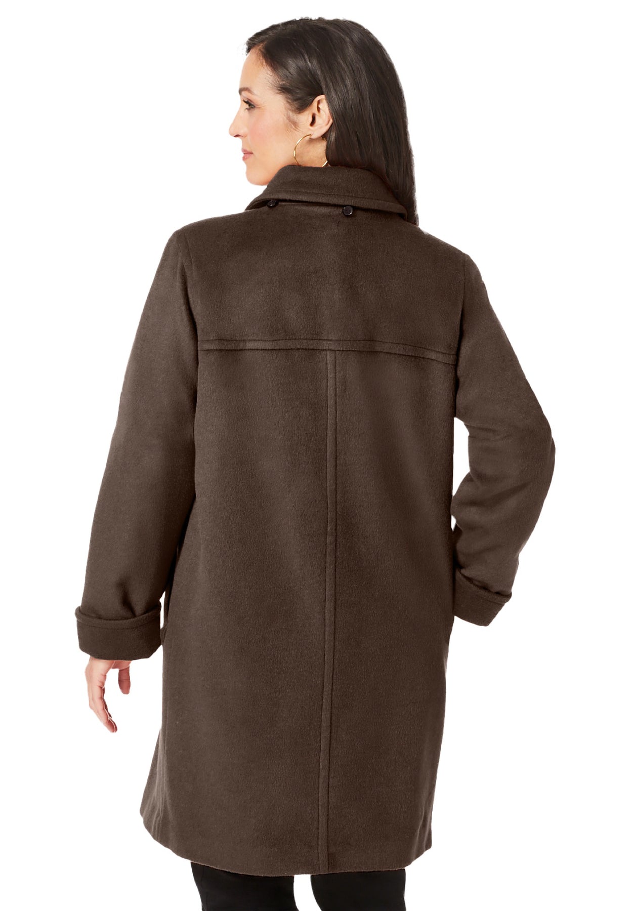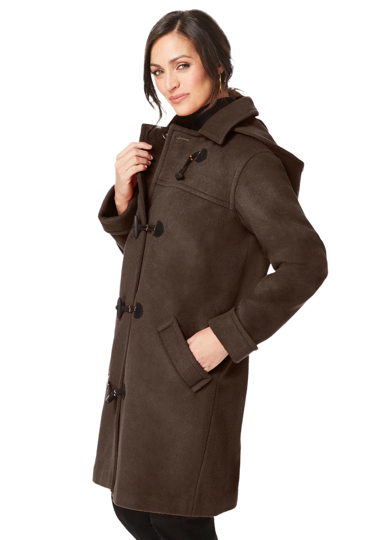 Keep your look chic and cozy in our wool coat with classic wood and faux-leather toggle front close. Side pockets and roll cuffs. Versatile button-off hood.