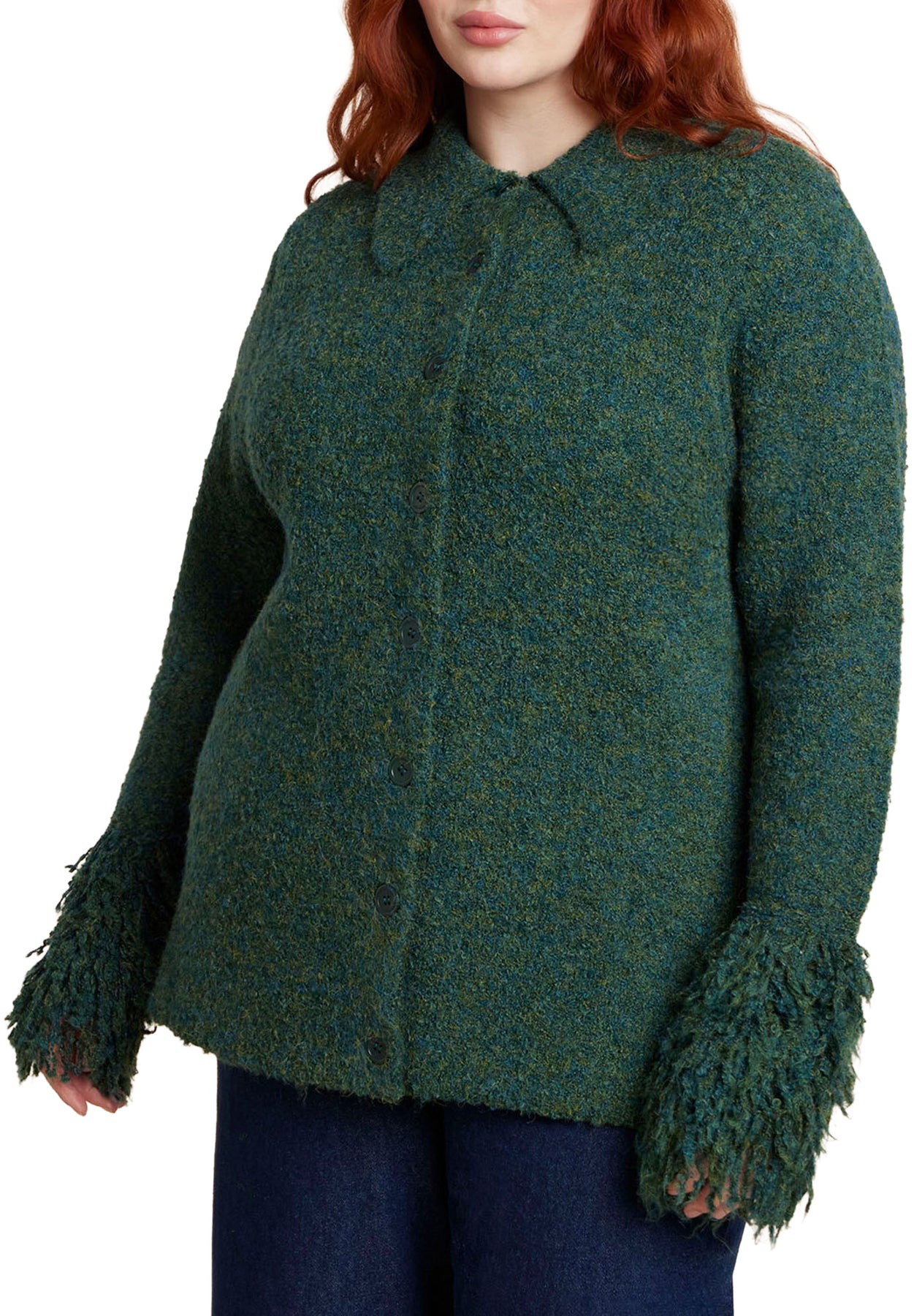 Texture play is the name of the game in this buttoned knit cardigan—thanks especially to fringe cuffs and ultra-soft stitching.