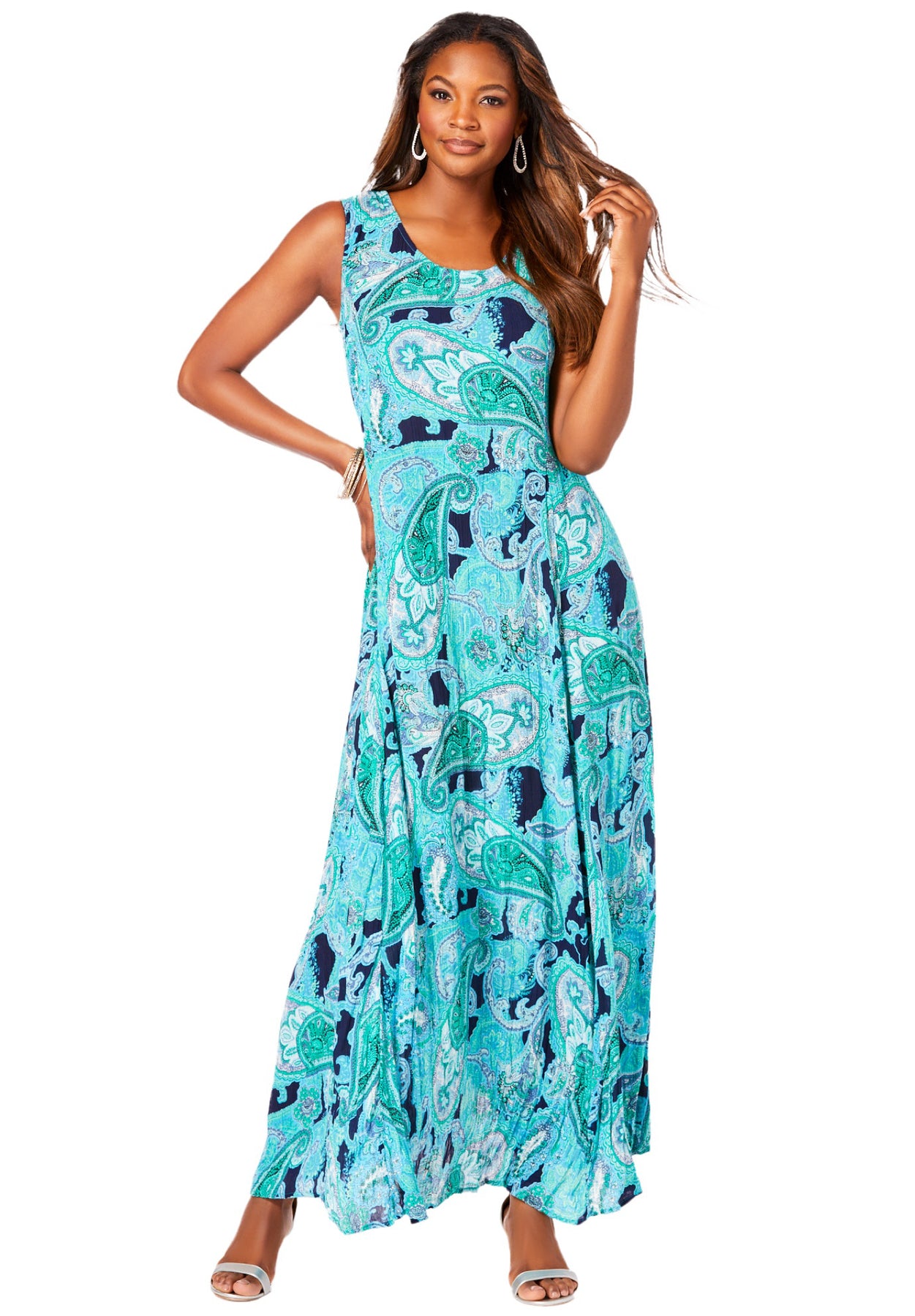 Get ready to own the room in this sweeping sleeveless dress in your favorite crinkle fabric. Princess seams and an A-line silhouette make for an unbelievably flattering shape. Pullover style and scoop neckline.