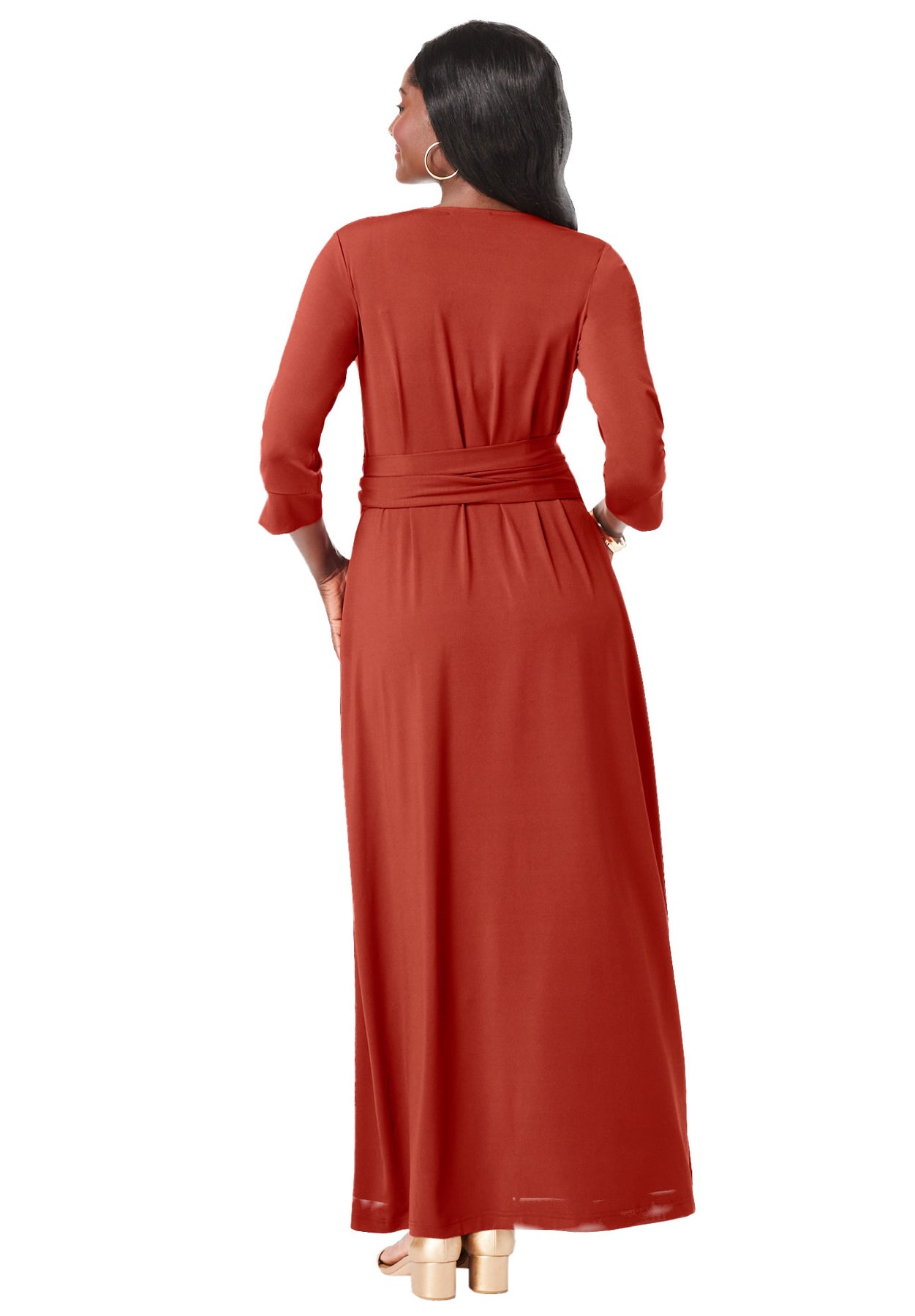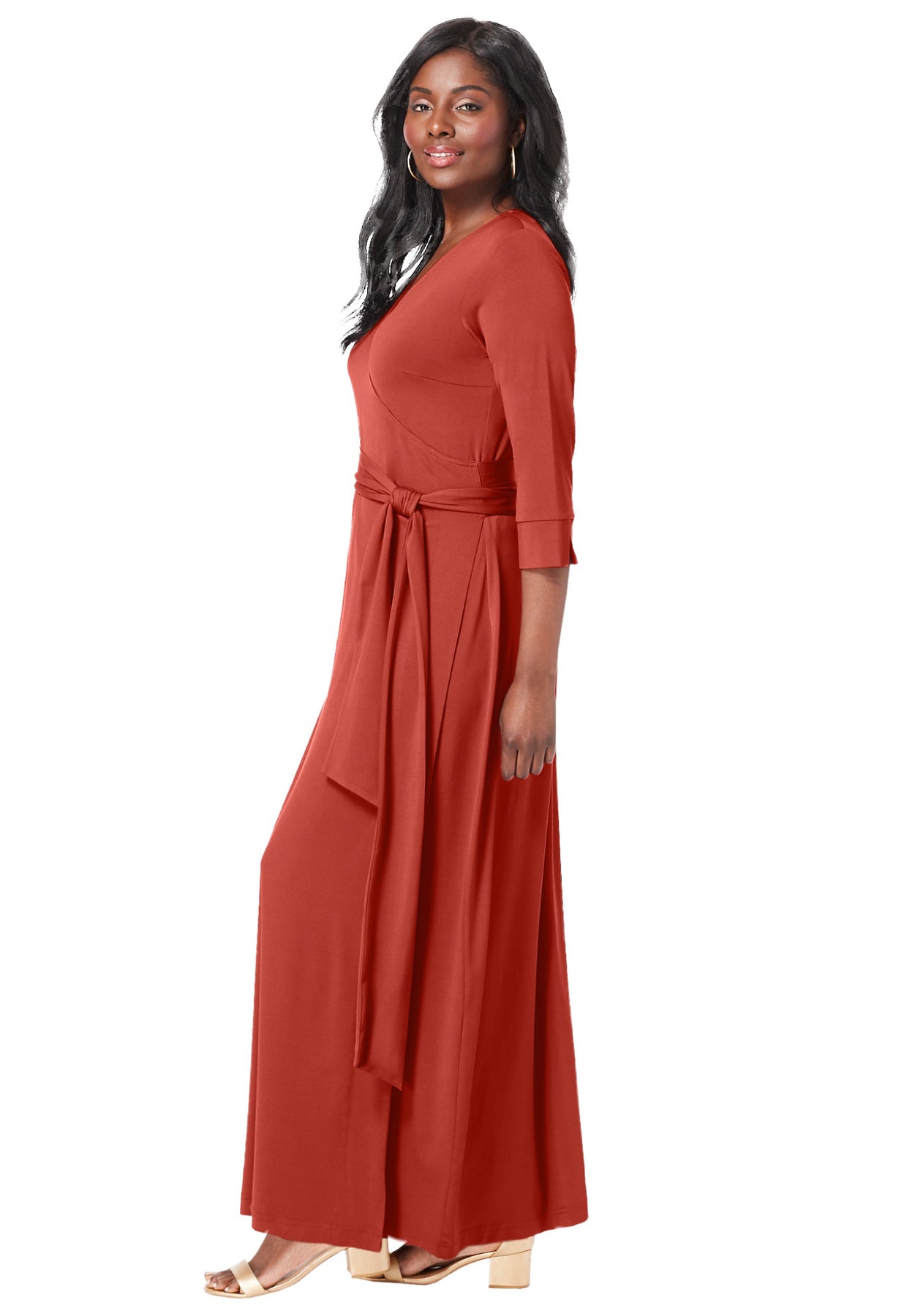 Comfortable, stretch knit fabric, a feminine V-neck and a fabulous faux wrap front make this maxi dress a must-have addition to every woman's wardrobe. Complete with three-quarter length sleeves to transition your style from this season into next, plus an A-line silhouette that universally flatters every figure, there's nothing about this look that you won't love.