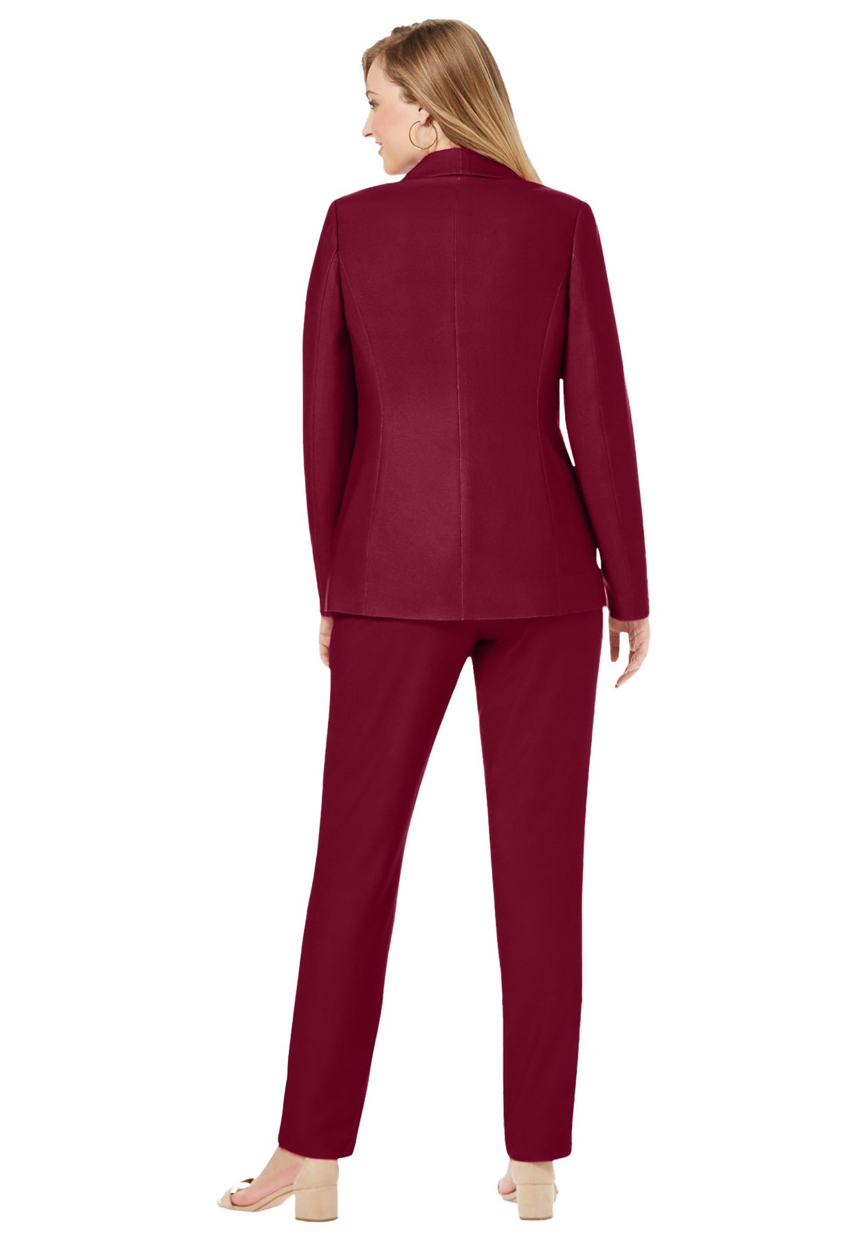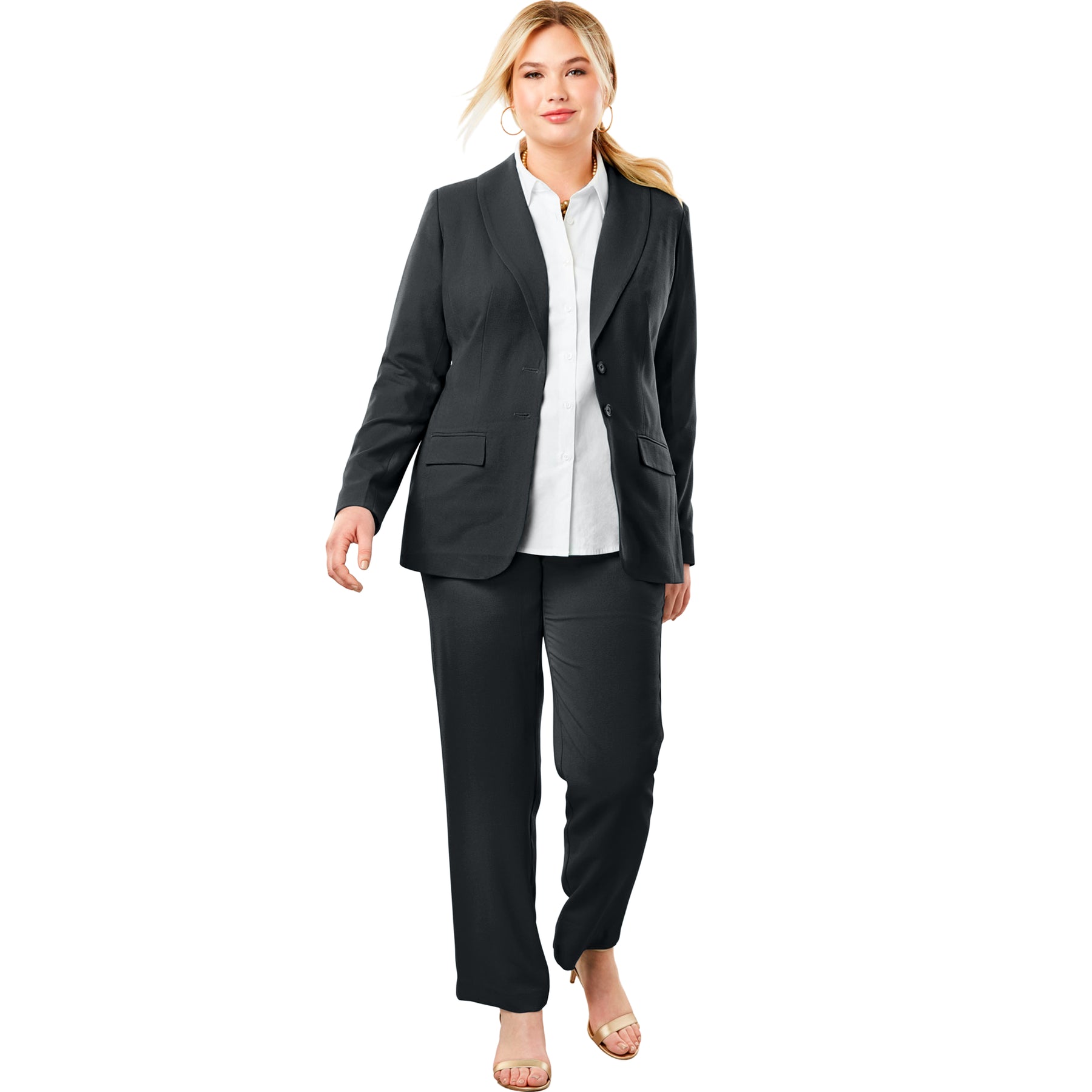 The Jessica London women's plus size 2-Piece Stretch Crepe Single-Breasted Pantsuit is a perfectly polished addition to your workweek wardrobe. A classic shawl-collar jacket tops flat-front pants with comfortable side-back elastic waist and hook-and-eye closure. Pair with a blouse or a timeless tunic for a professional look that will let people know that you mean business.