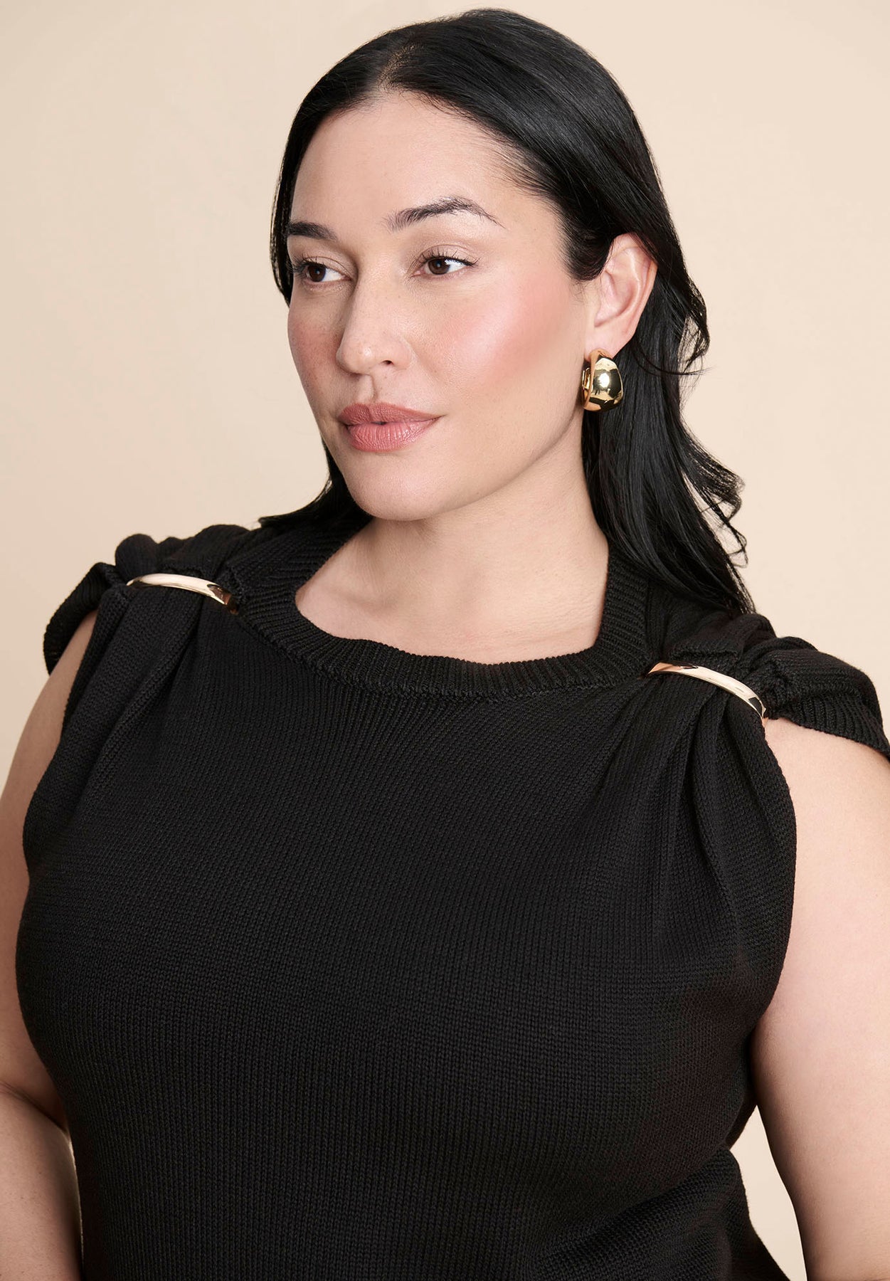 Add subtle edge to your LBD lineup with this sleeveless sweater dress accented by metallic hardware at the shoulders. A close fit and sleek knit make it an instant statement piece.