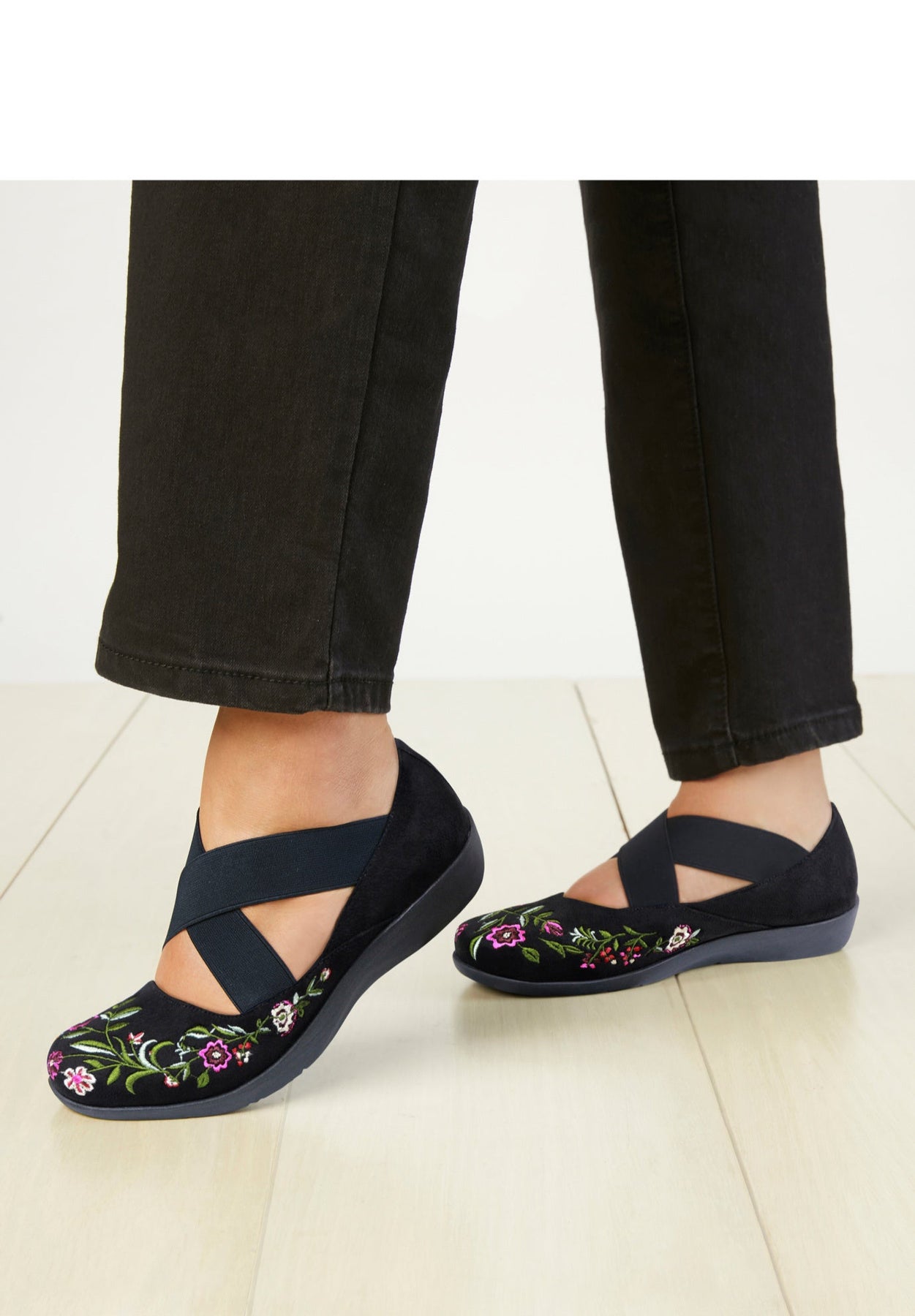 A supple suede-like upper with crisscross elastic straps refine an essential Mary Jane flat grounded by a lightweight bottom with cupped insole to stabilize heel.