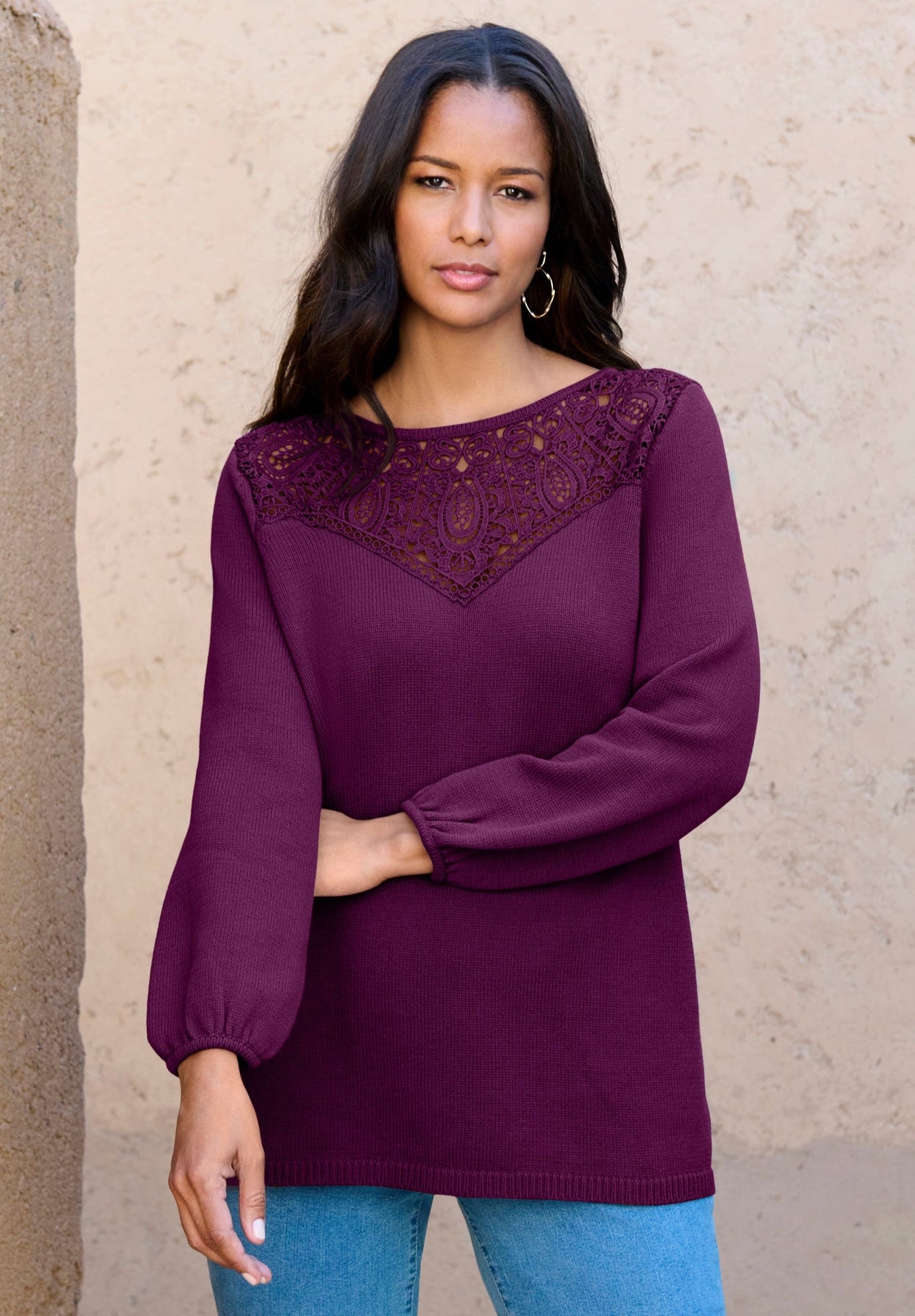 This pullover sweater gets a romantic upgrade with lace-mesh detailing at the yoke and elasticized blouson sleeves.