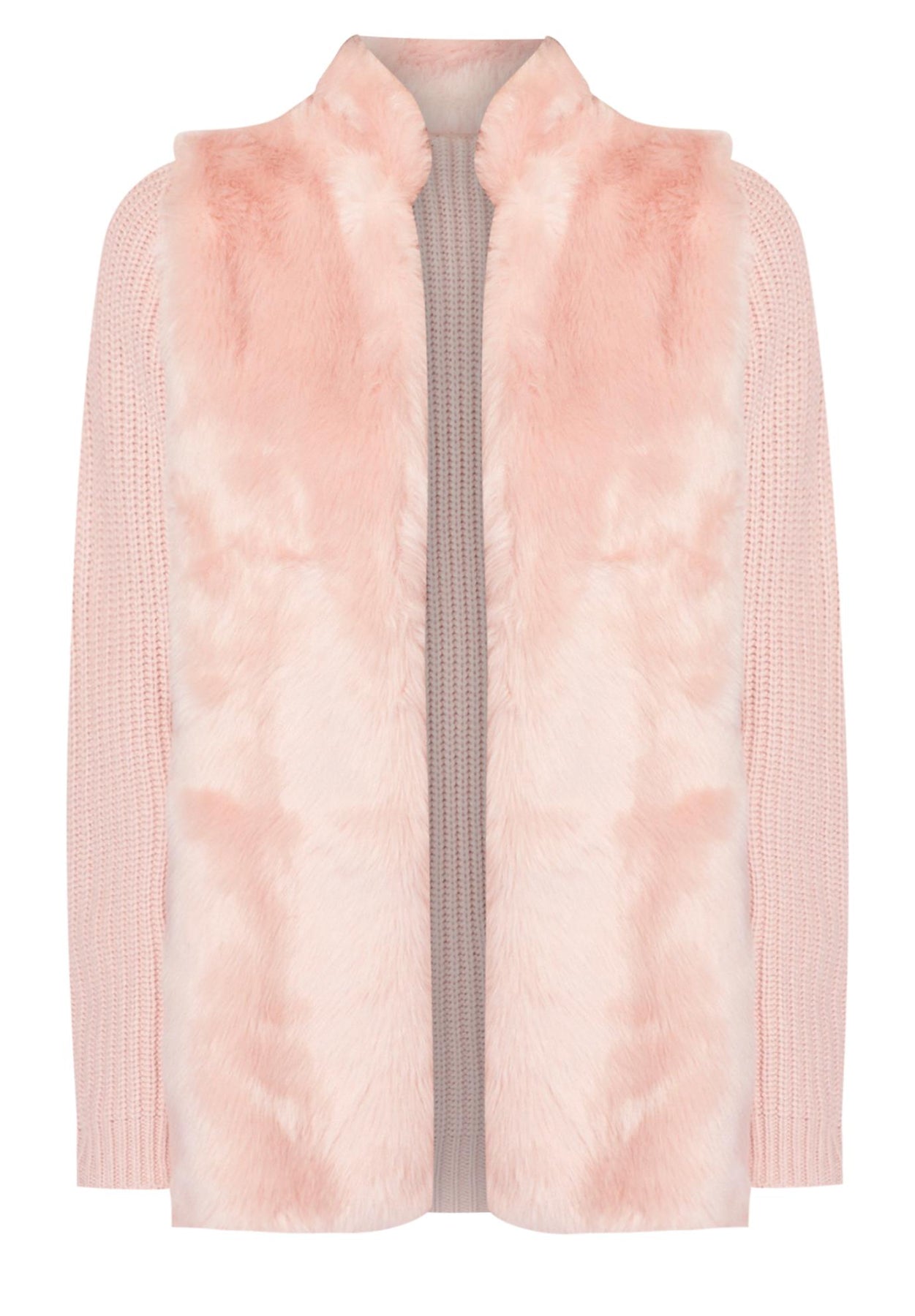 A seriously glamorous sweater, this rib knit cardigan gets a layer of luxe with a faux-fur front. Open front. Rib knit back and sleeves.