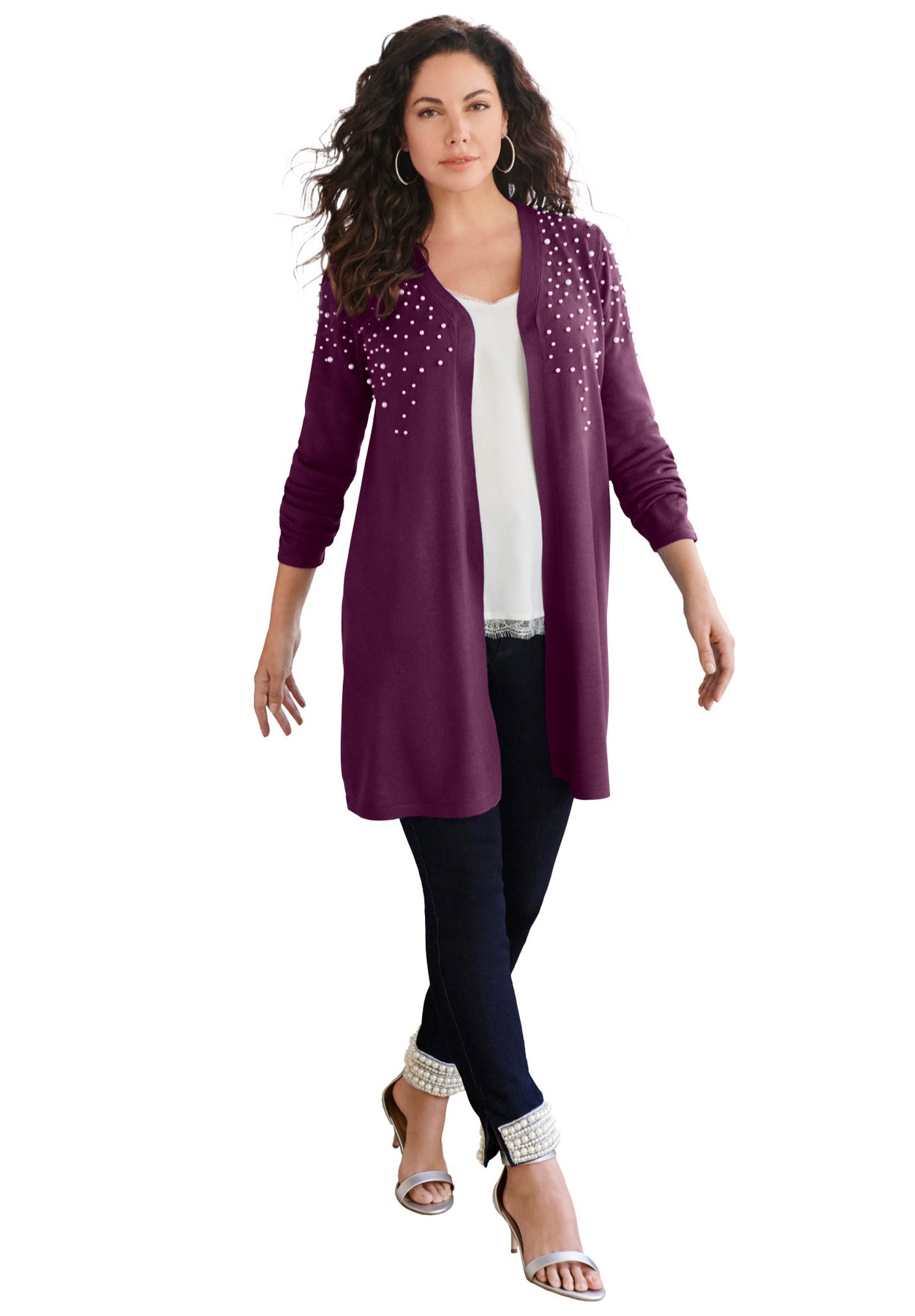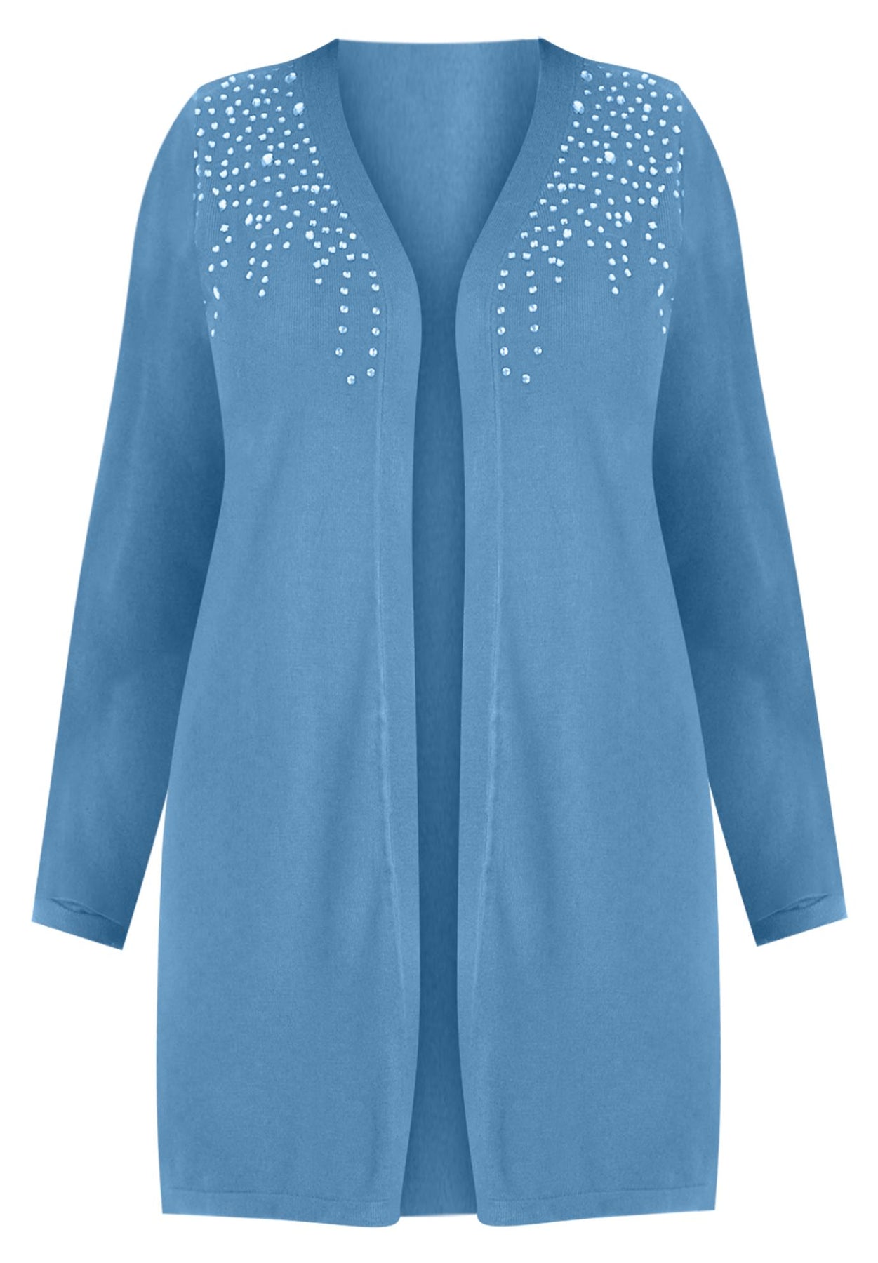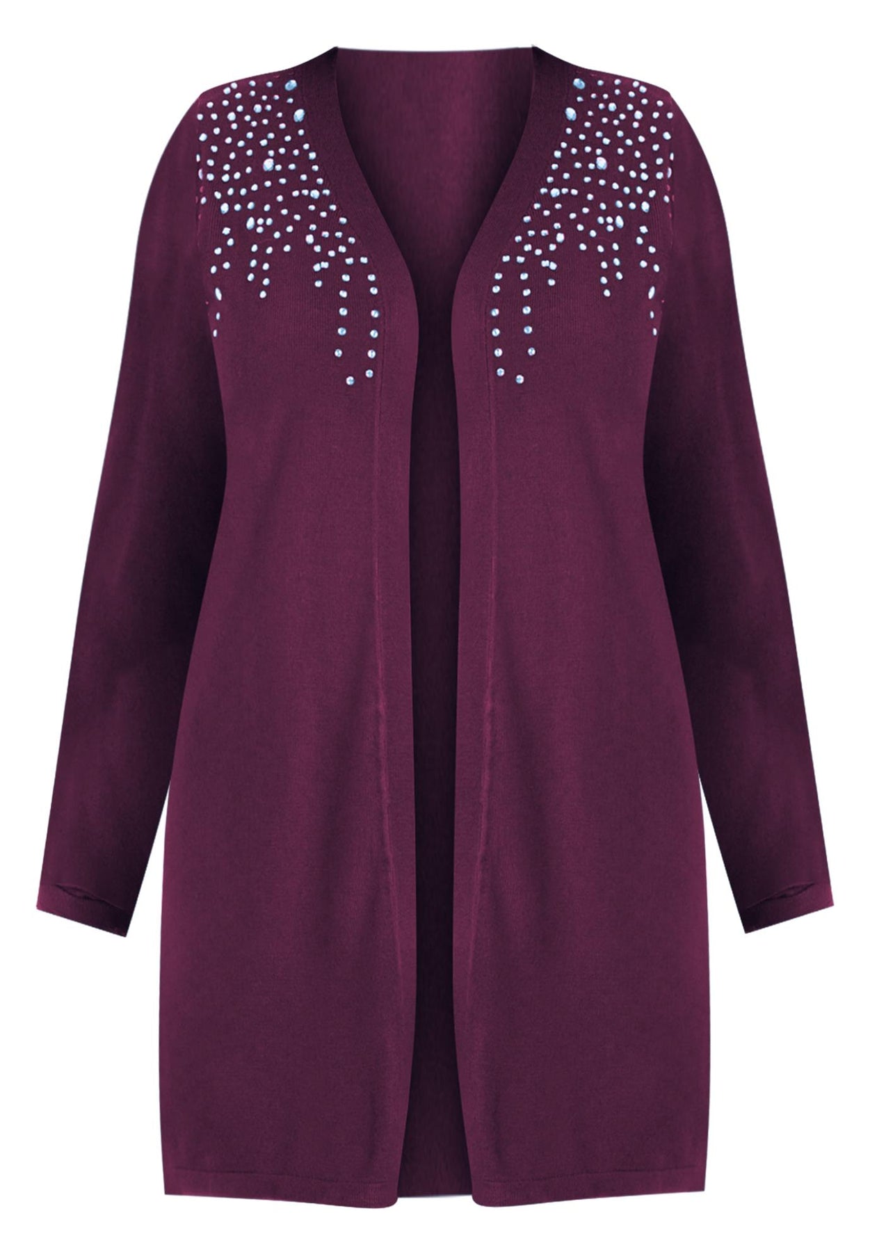 Get a touch of sparkle in this open-front sweater with embellishment at the shoulders. Long sleeves.