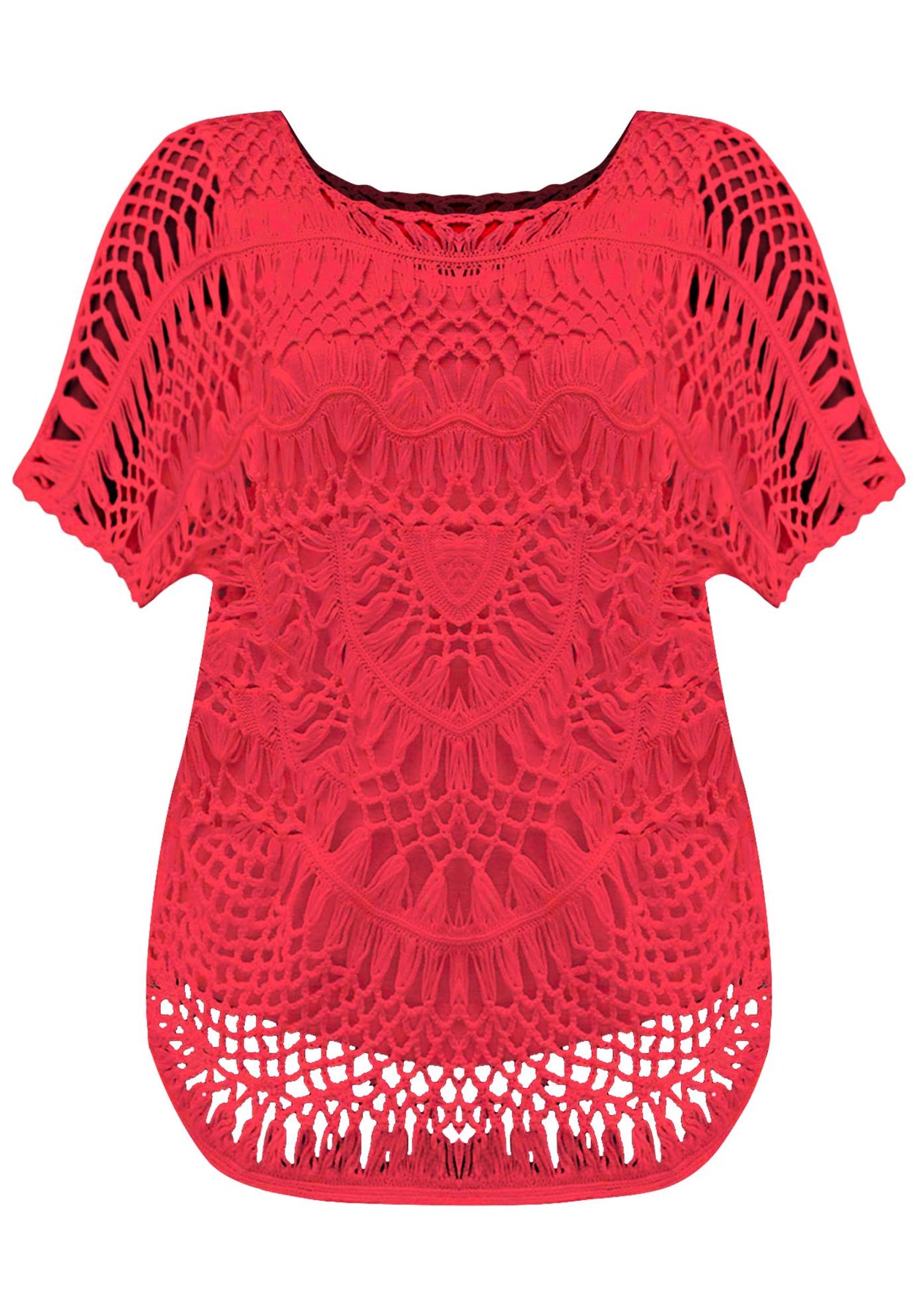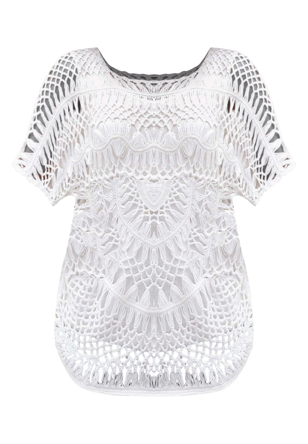 The open hand crochet stitch work and flattering fit will have you reaching for this sweater again and again. Pullover style, short batwing sleeves, rounded hem.