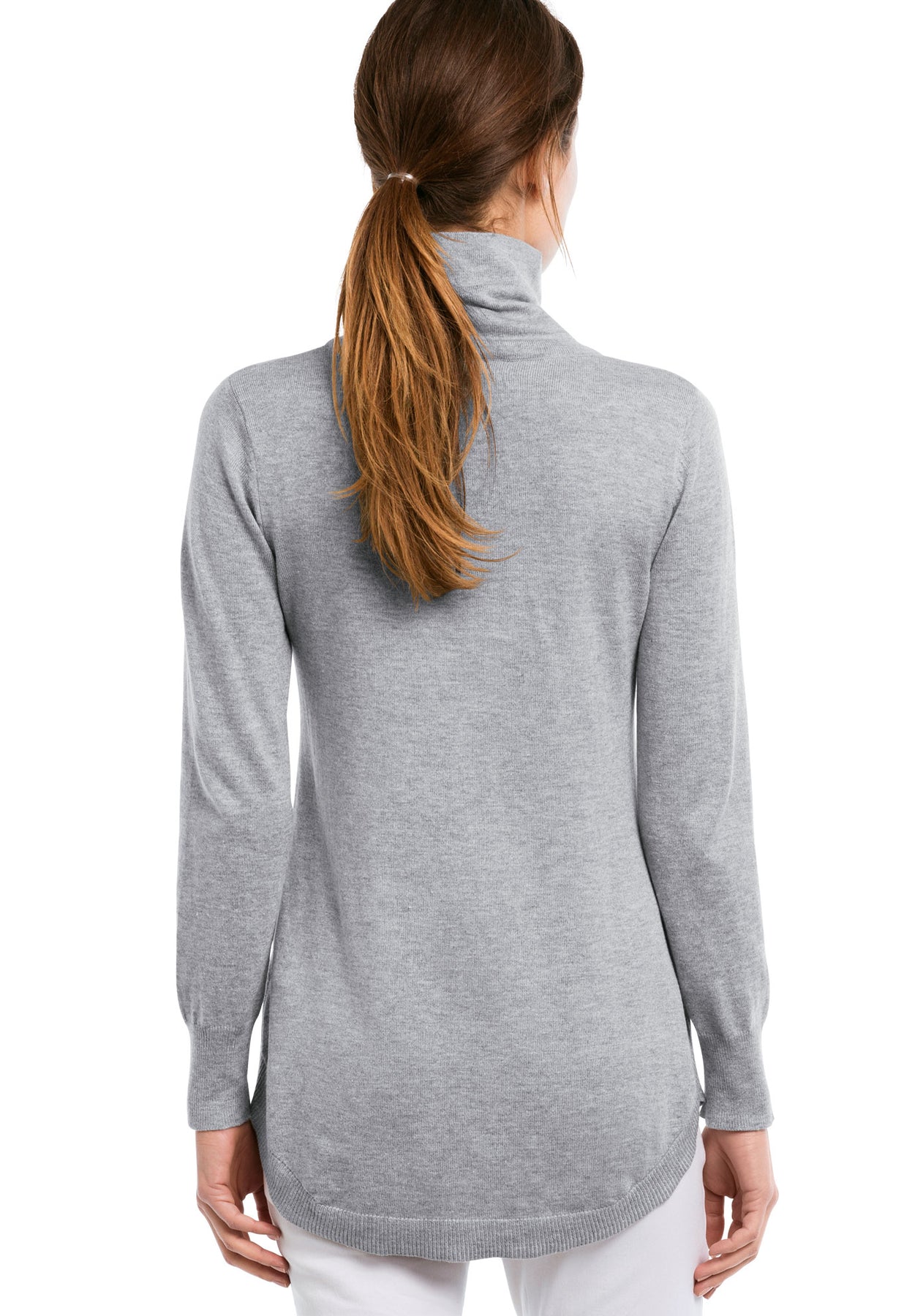 Fine gauge tunic sweater has a foldover turtleneck and long sleeves. Ribbing on the cuffs and on the slightly rounded hem.