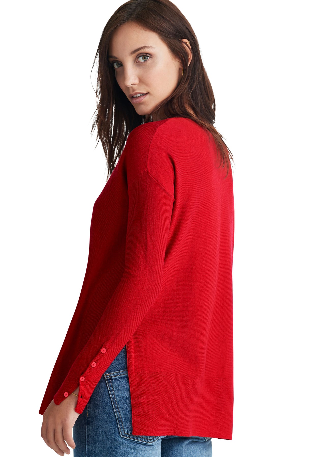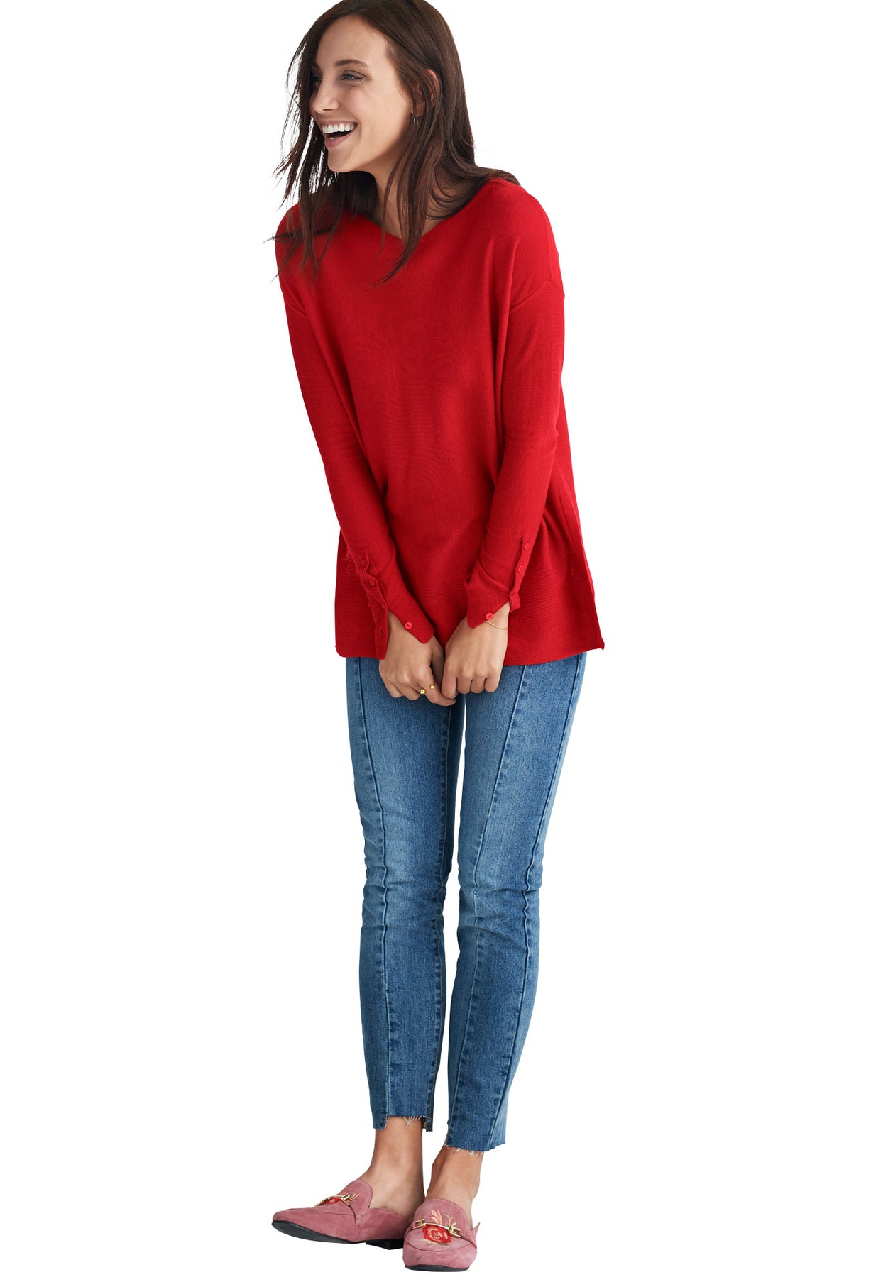 Cool and cloudy days require a pop of color and texture, and this lightweight knit sweater delivers. Features a boatneck with drop shoulders, long sleeves with 3 buttons & a slit at the rib cuff, this will quickly become a favorite.