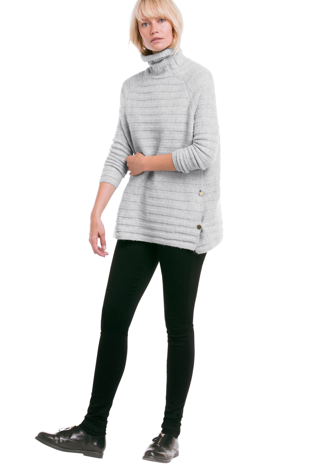 Truly timeless, our turtleneck sweater is a must for colder temps. The design features a boxy silhouette, long raglan sleeves and gold metal buttons down both sides. Style with cropped trousers and zip front oxfords for contemporary cool.