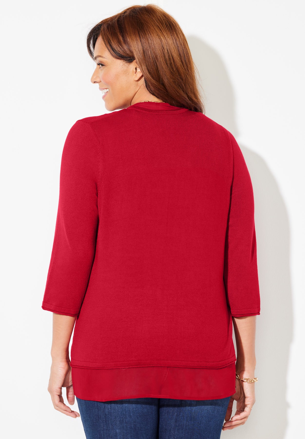 FIT: The fit is relaxed and easy. Styled with chiffon trim, three-quarter sleeves, and a straight hem.