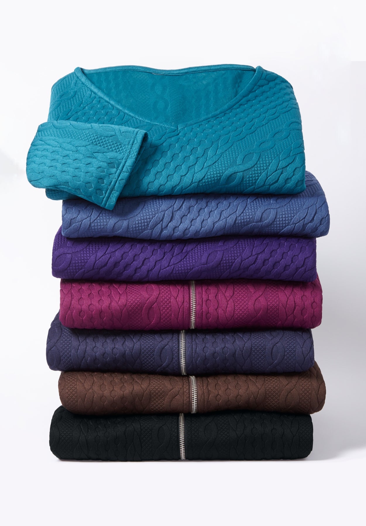 This Zip-Front Cable Jacket’s mission is to keep you fashionable and warm. We think it does its job beautifully. Just see how gracefully it drapes over your favorite top or tank and we bet you claim it as your easy layering essential. If you love this, we think you would also love our Spliced Cable Tunic