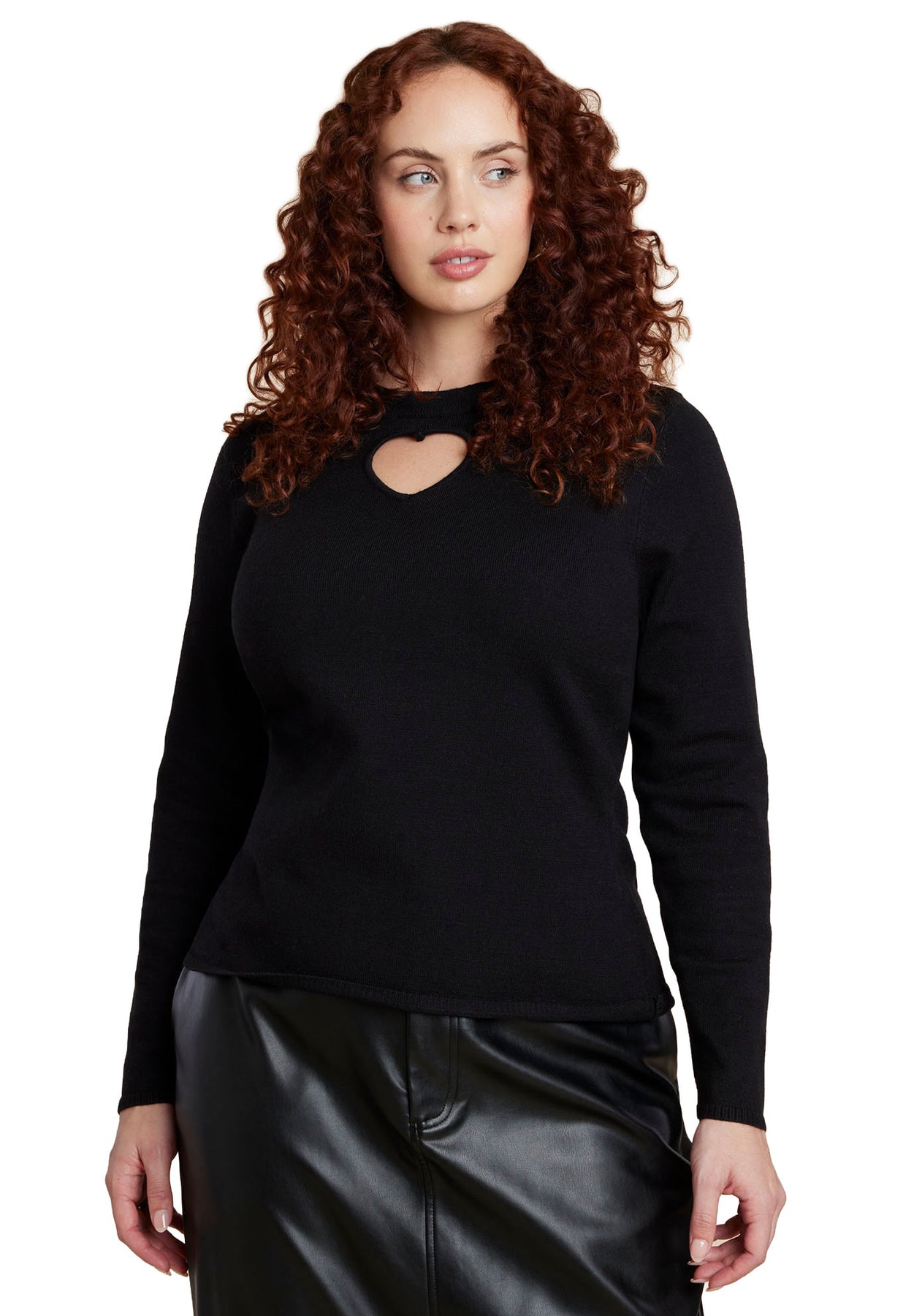 Make a sweet yet striking statement in this heart–cutout sweater. Crafted from a soft stretch knit with a close, flattering fit, it offers effortless comfort and infinite styling potential.