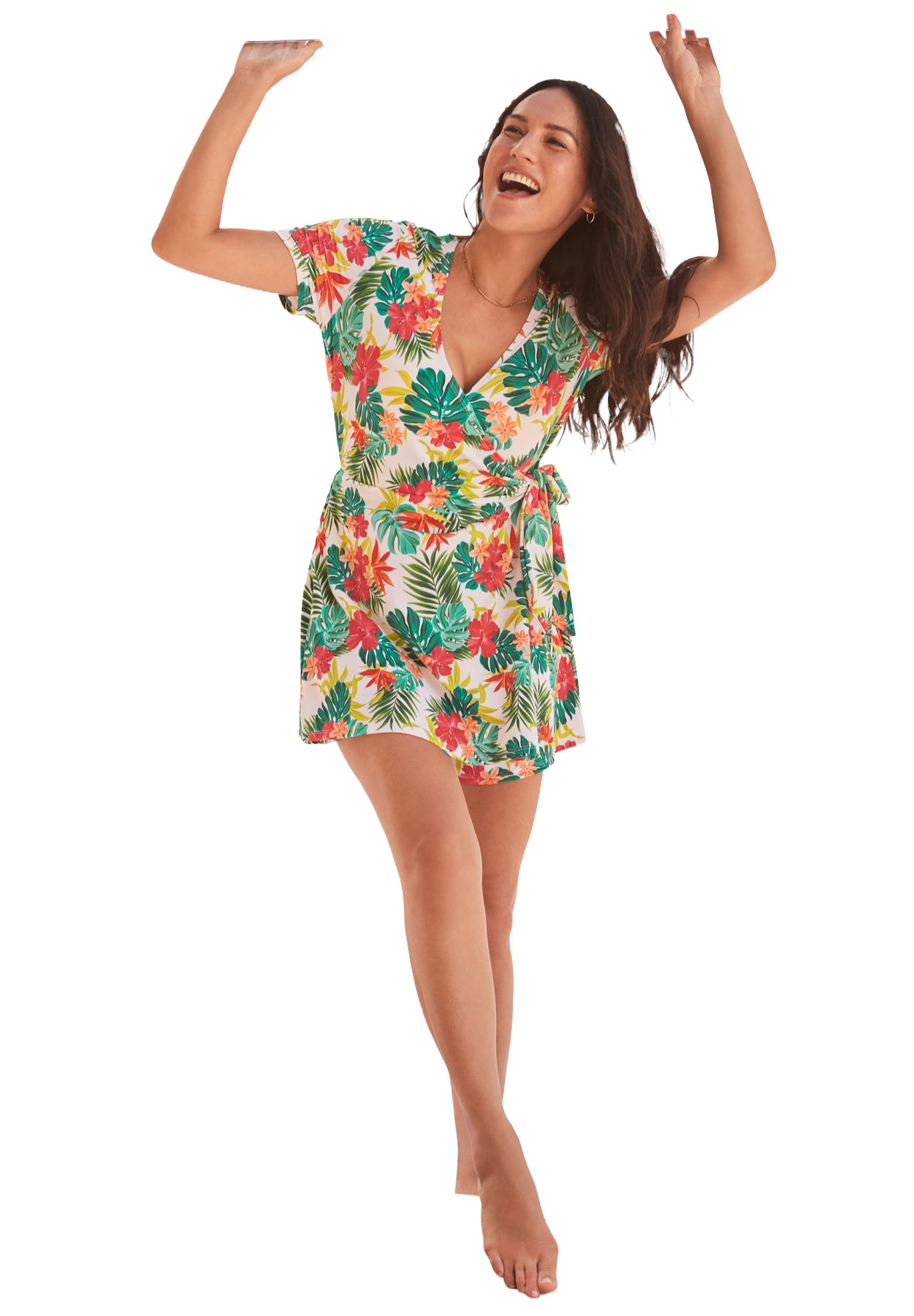 Made to flatter, this swim romper features a wrap-style front with a functional tie, supportive sewn-in cups, and a Power-mesh bodice for a smoothing fit. The short sleeves provide comfortable coverage, and side seam pockets add an extra touch of convenience. Style it with statement earrings and sandals for a confident, put-together look that's ready for sun and socializing.