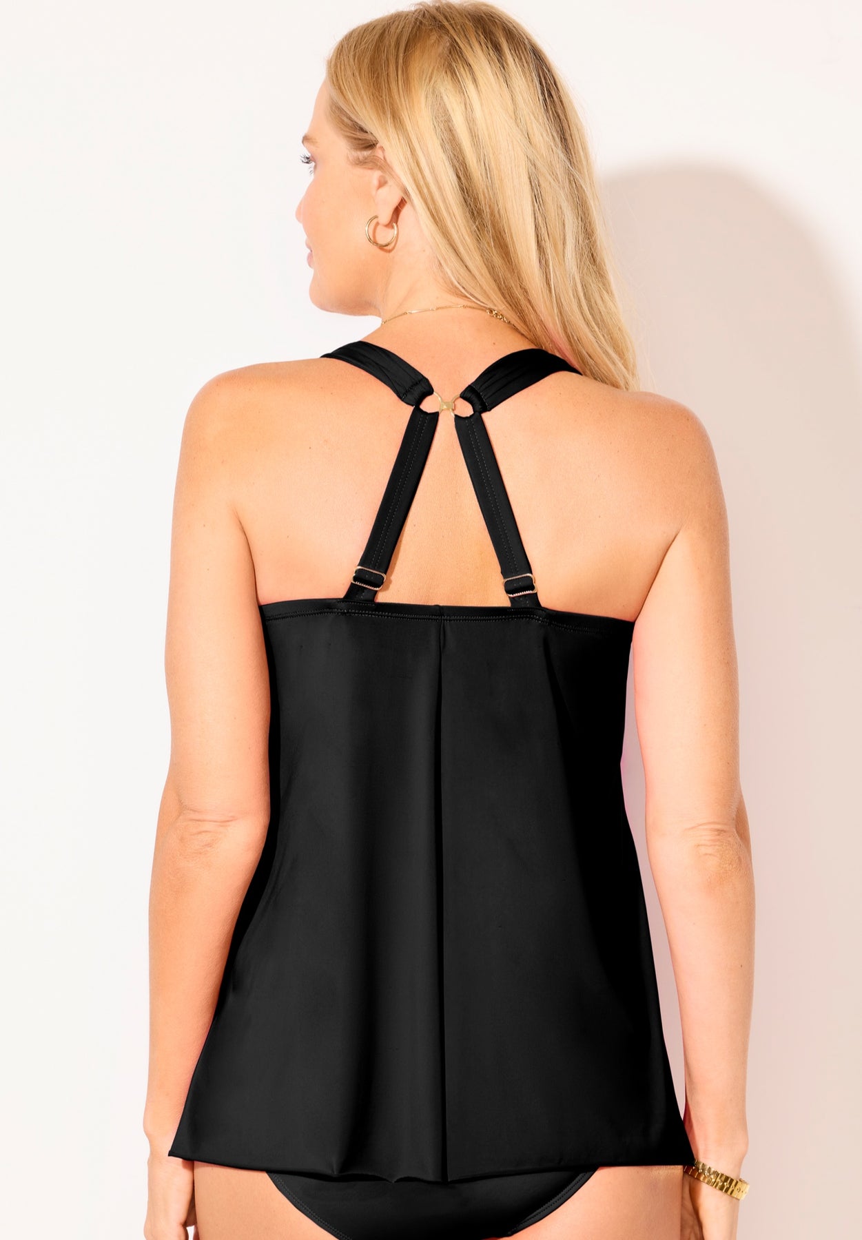 Effortlessly elegant and beautifully supportive, this bra sized tankini top blends the comfort of a flowy silhouette with the structure of a perfectly fitted bra. Molded cups provide lift and shaping, while lightweight shirring and a soft drape overlay at the bust create a flattering, feminine feel. J-hook multiway straps let you customize your style and support, and a secure G-hook closure ensures a confident fit. Finished with a raw-edge hem.