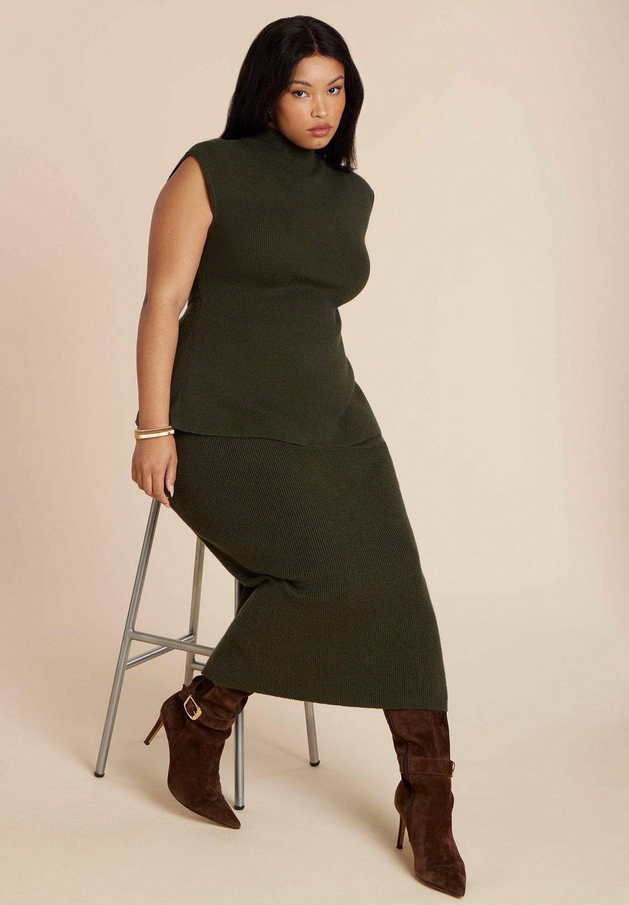 Business-in-the-front, party-in-the-back is the name of the game for this mock neck sweater top. Its sleeveless design is cut with an unexpected open back cutout, making it a sleek pick for day-to-night styling.