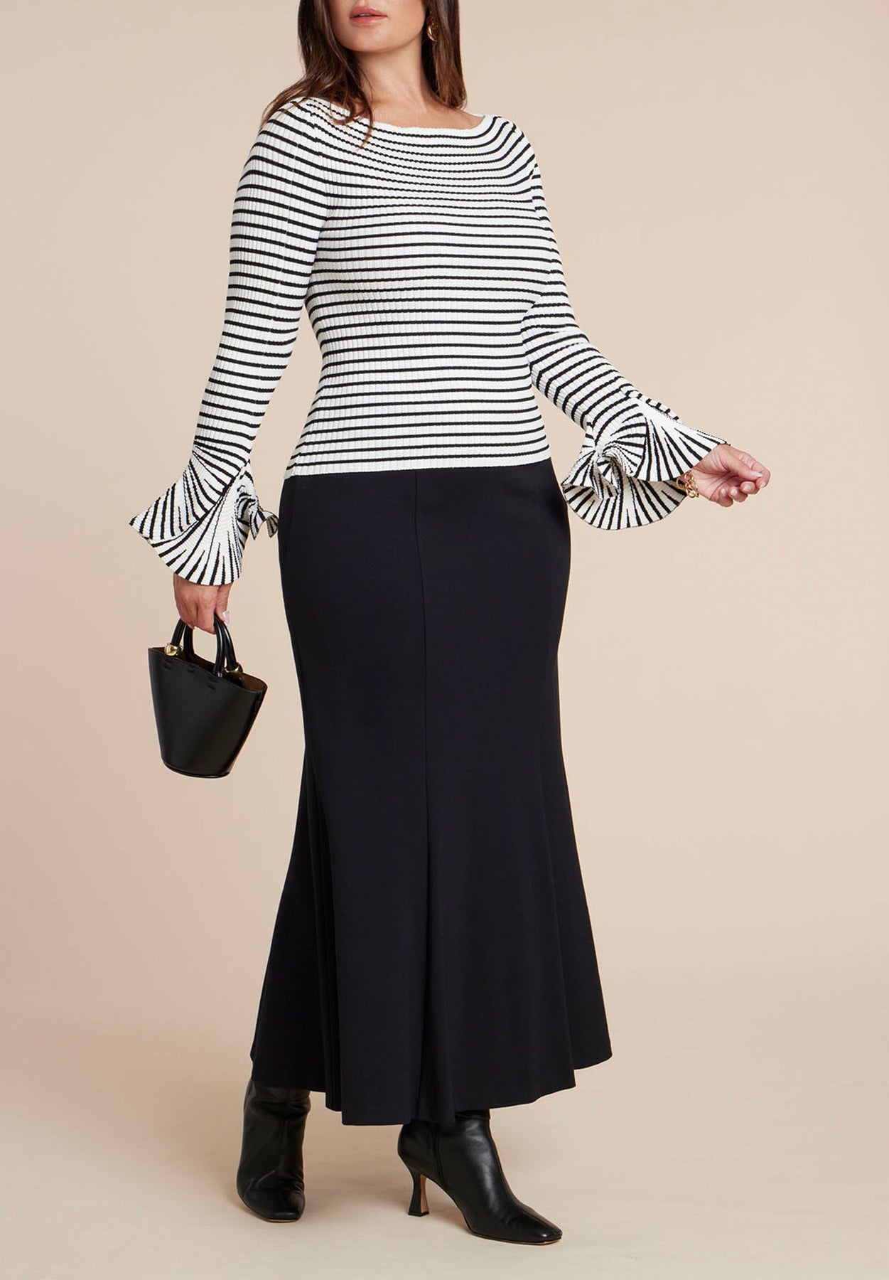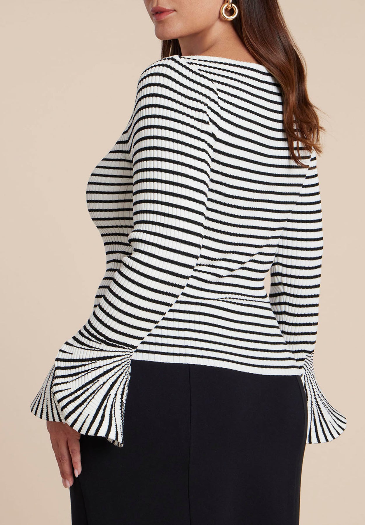 Make a subtle statement in this striped, ribbed knit sweater, where an elegant boat neck and sculpturally flared sleeves bring movement to every gesture.