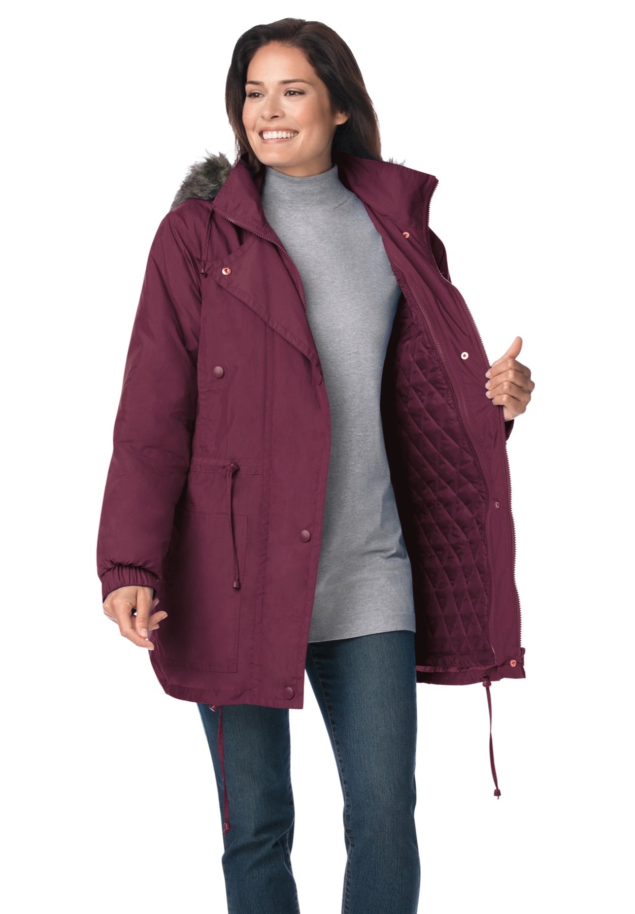 - Detachable hood with faux-fur trim for extra warmth and style.