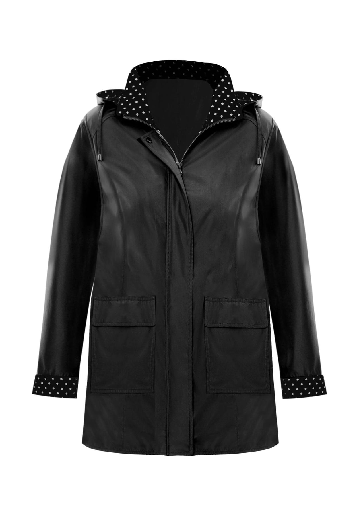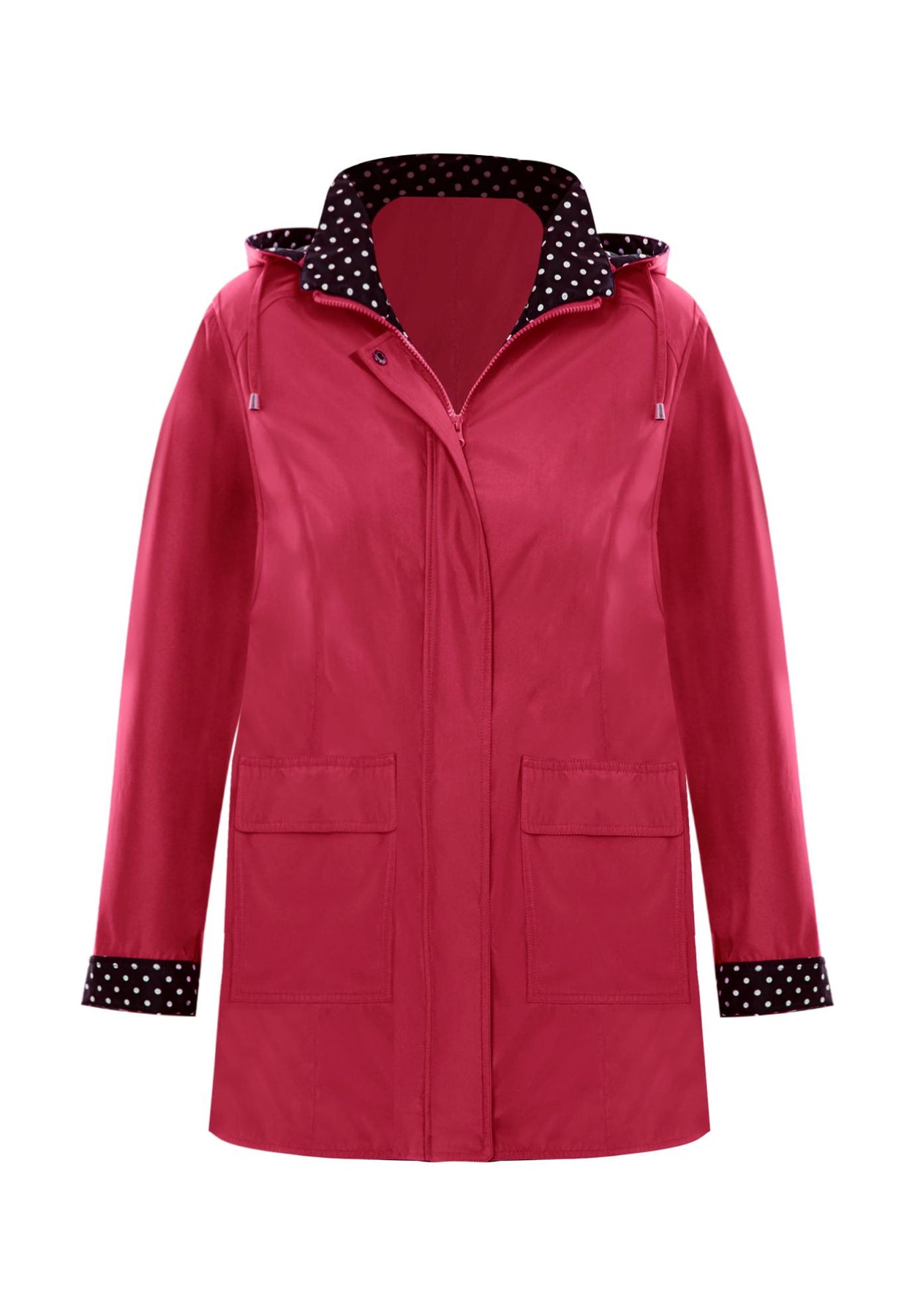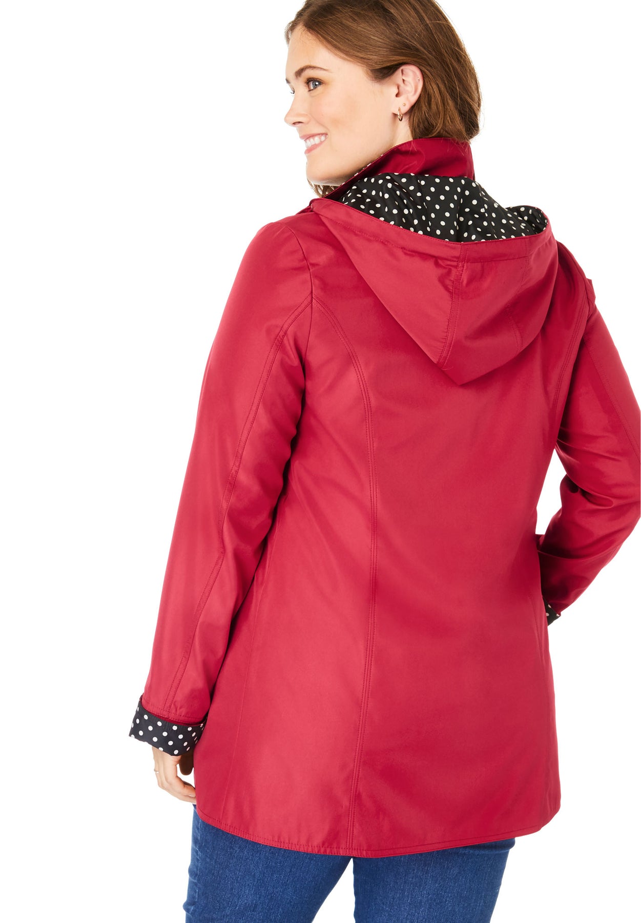 Our plus size rain jacket is perfect for multi-season comfort. The fun dot trim will make you the best dressed even in the rain.