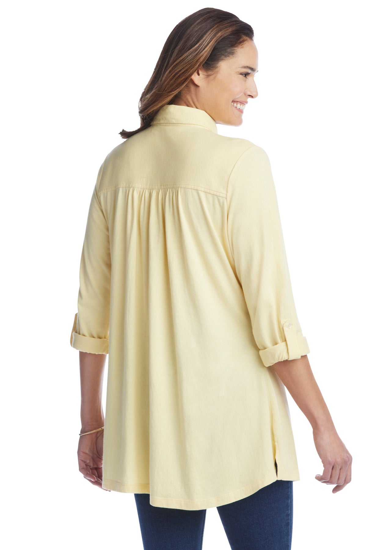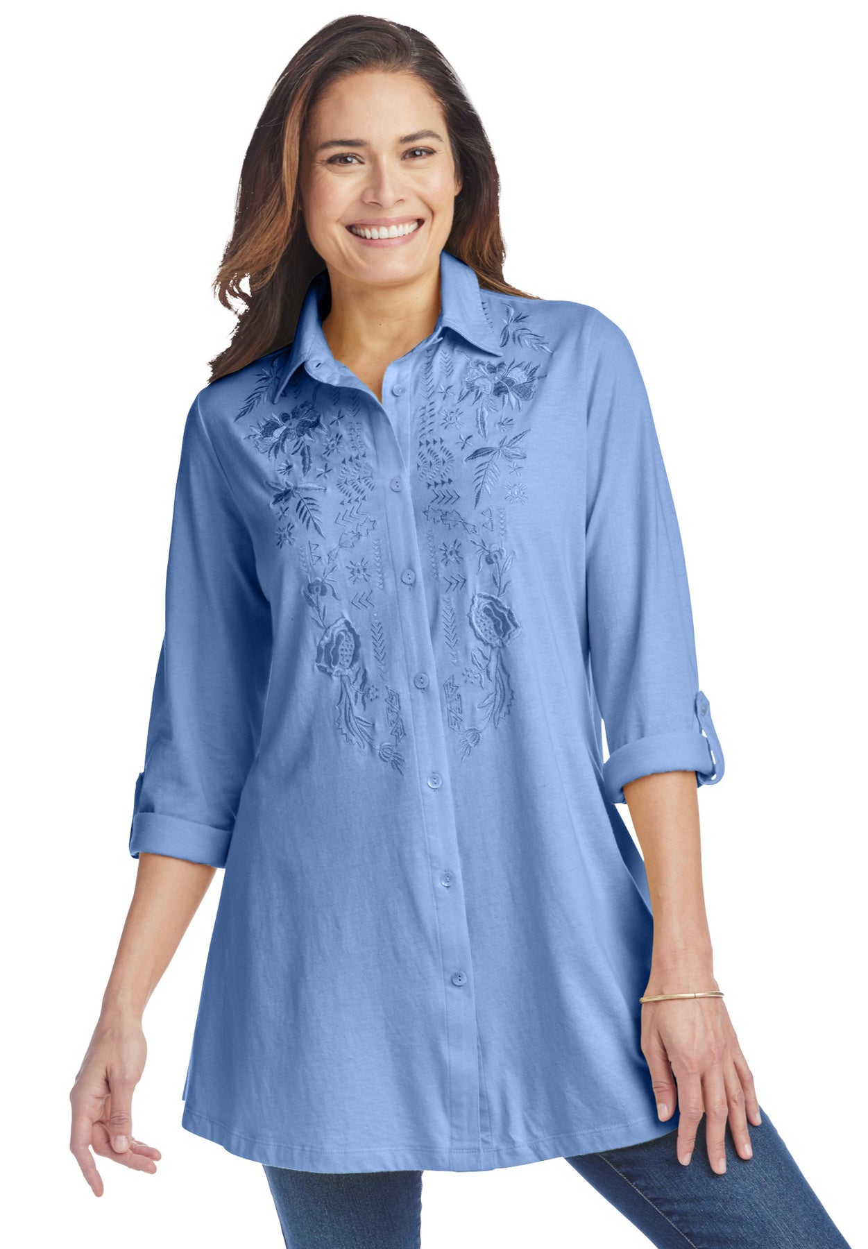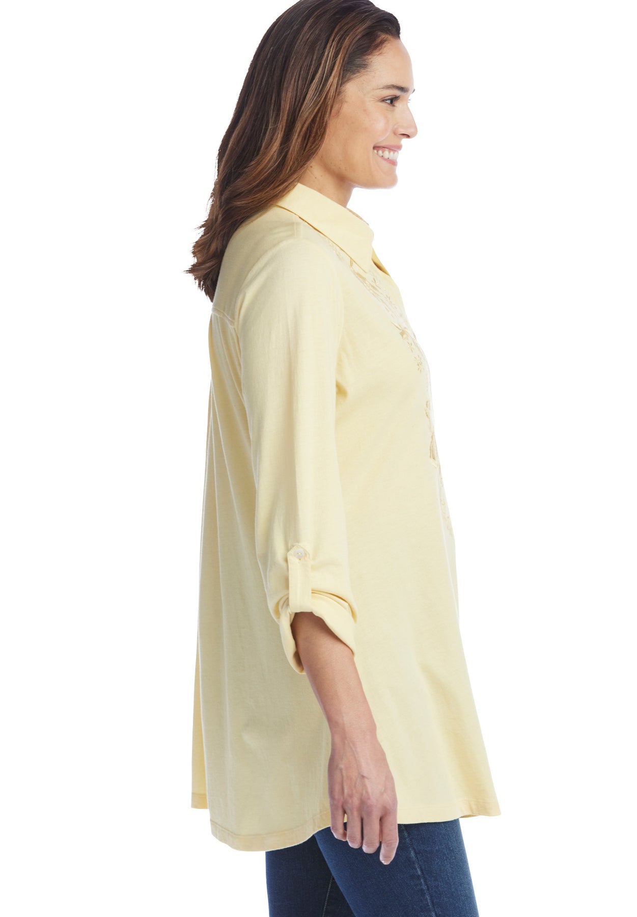 This tunic has all the right details. It has a classic shirt collar, dyed-to-match embroidery and roll tab sleeves. A full button front makes for easy wearing.