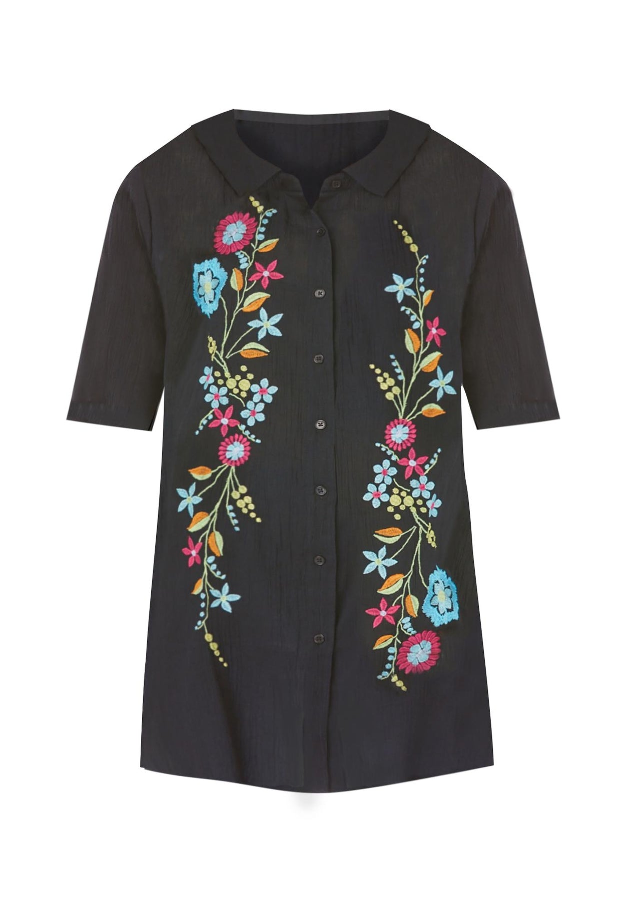 An everyday essential, this button-front style is beautifully embroidered gauze shirt with multi color embroidery. Elbow length sleeve with shirt with collar offer extended styling options so you can get the more casual or relaxed look you like.