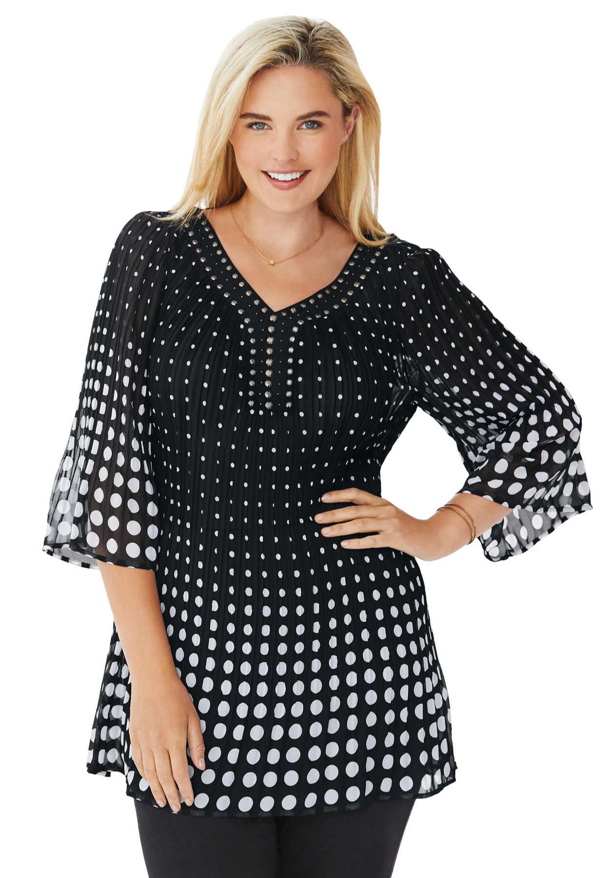 Allover pleating and dreamy bell sleeves create an easy fit. A studded neckline is a pretty touch and adds even more depth to the beautiful prints. Made in a poly georgette for an airy feel.