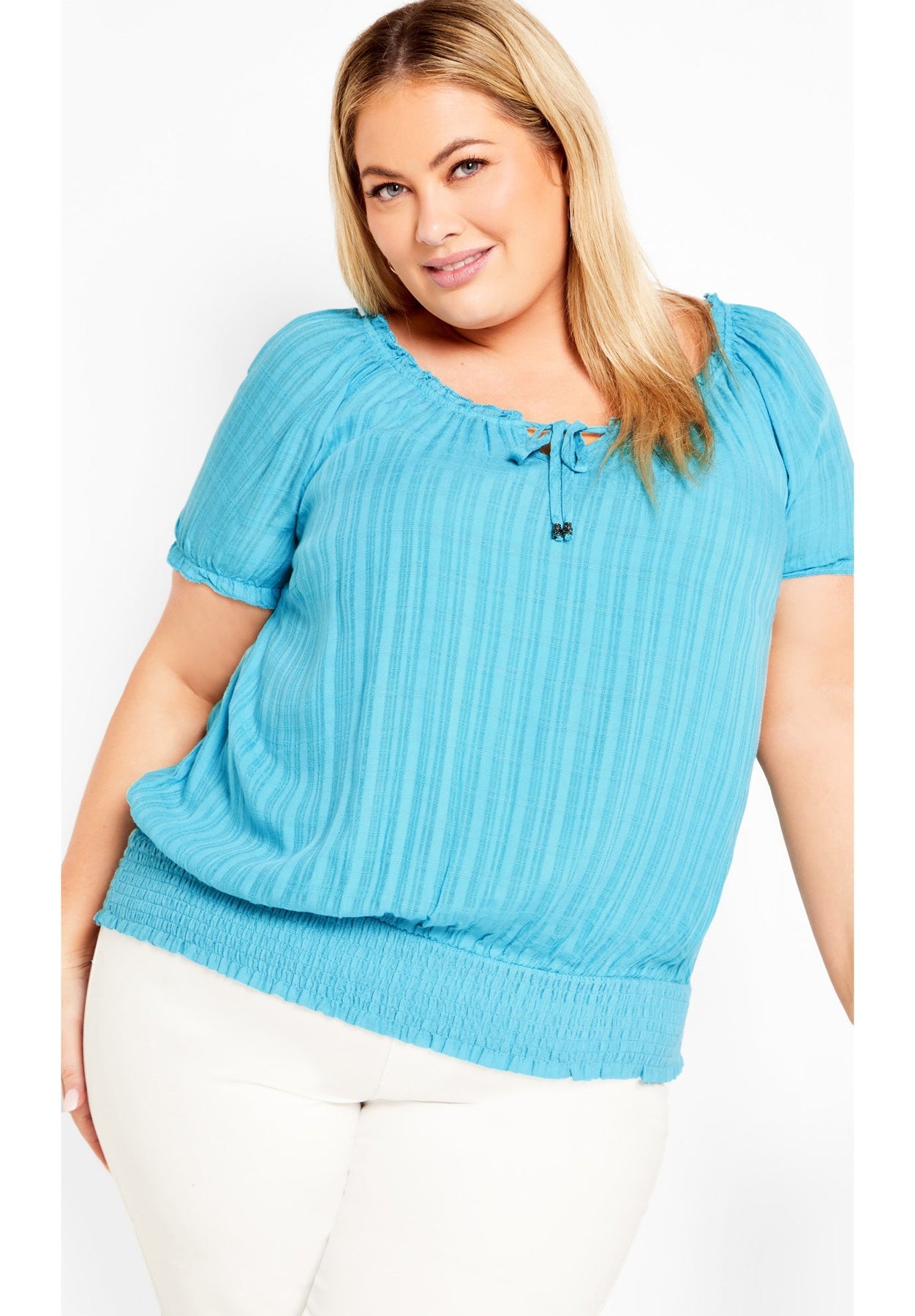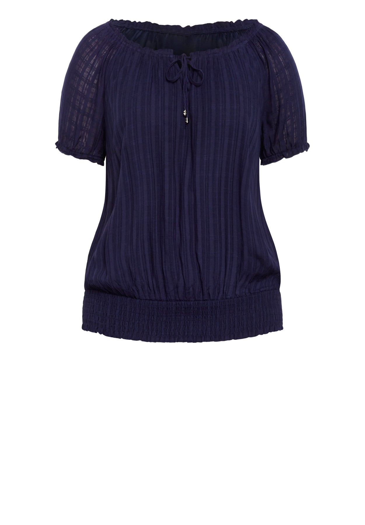 Upgrade your wardrobe with the elegance of the Oceana Top, designed with a notched V-neckline and a stylish drawstring front tie-up detail. The short balloon sleeves and elasticated ruffle neckline and cuffs enhance its feminine appeal, while the pull-over style, relaxed fit, and shirred hemline make this hip-length top a versatile piece. Key Features Include: - Notched V-neckline - Drawstring front tie-up detail - Short balloon sleeves - Elasticated ruffle neckline and cuff details - Lined - Relaxed fit - Pull over style - Shirred hemline - Hip length Wear this with a maxi skirt and wedges.