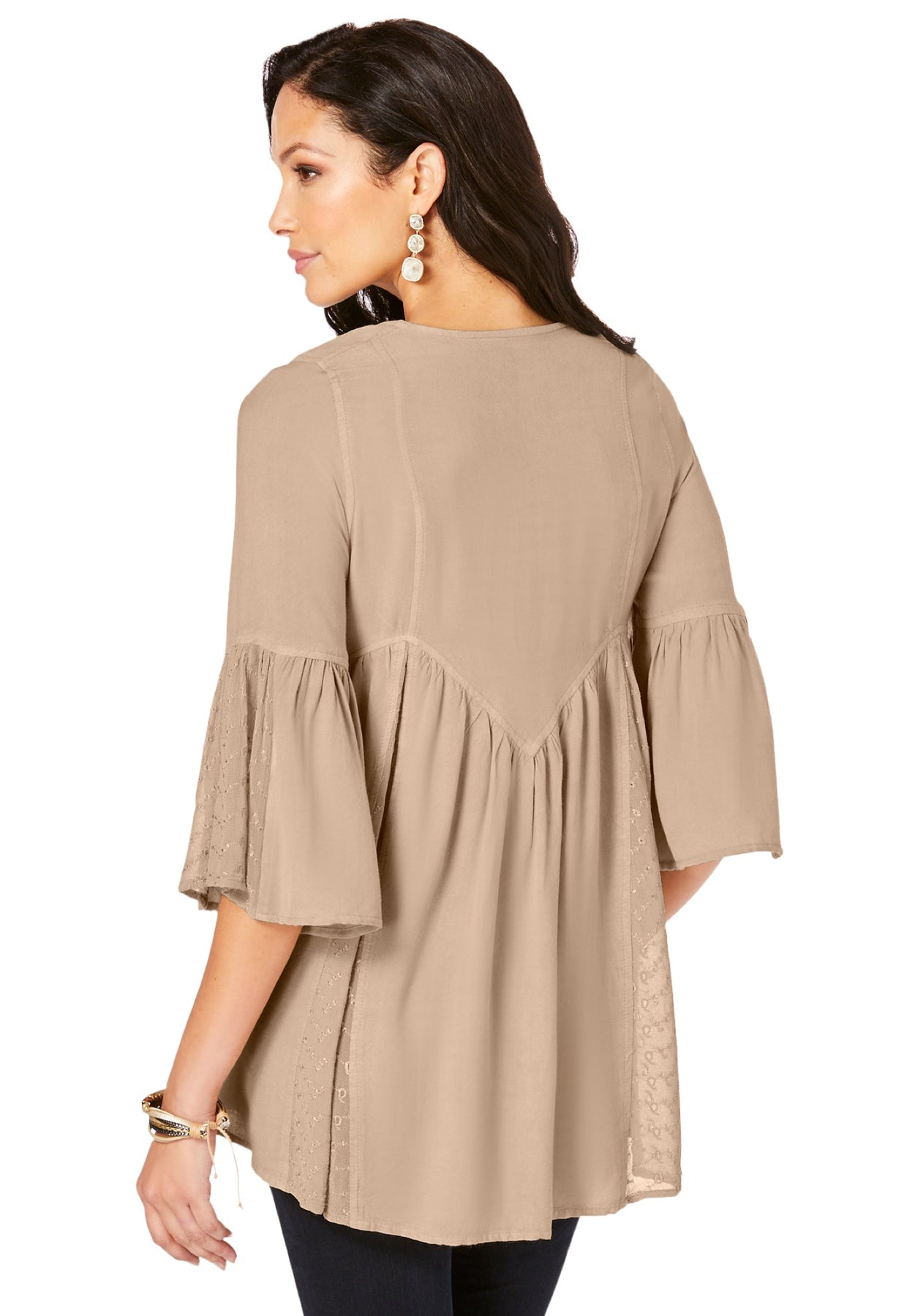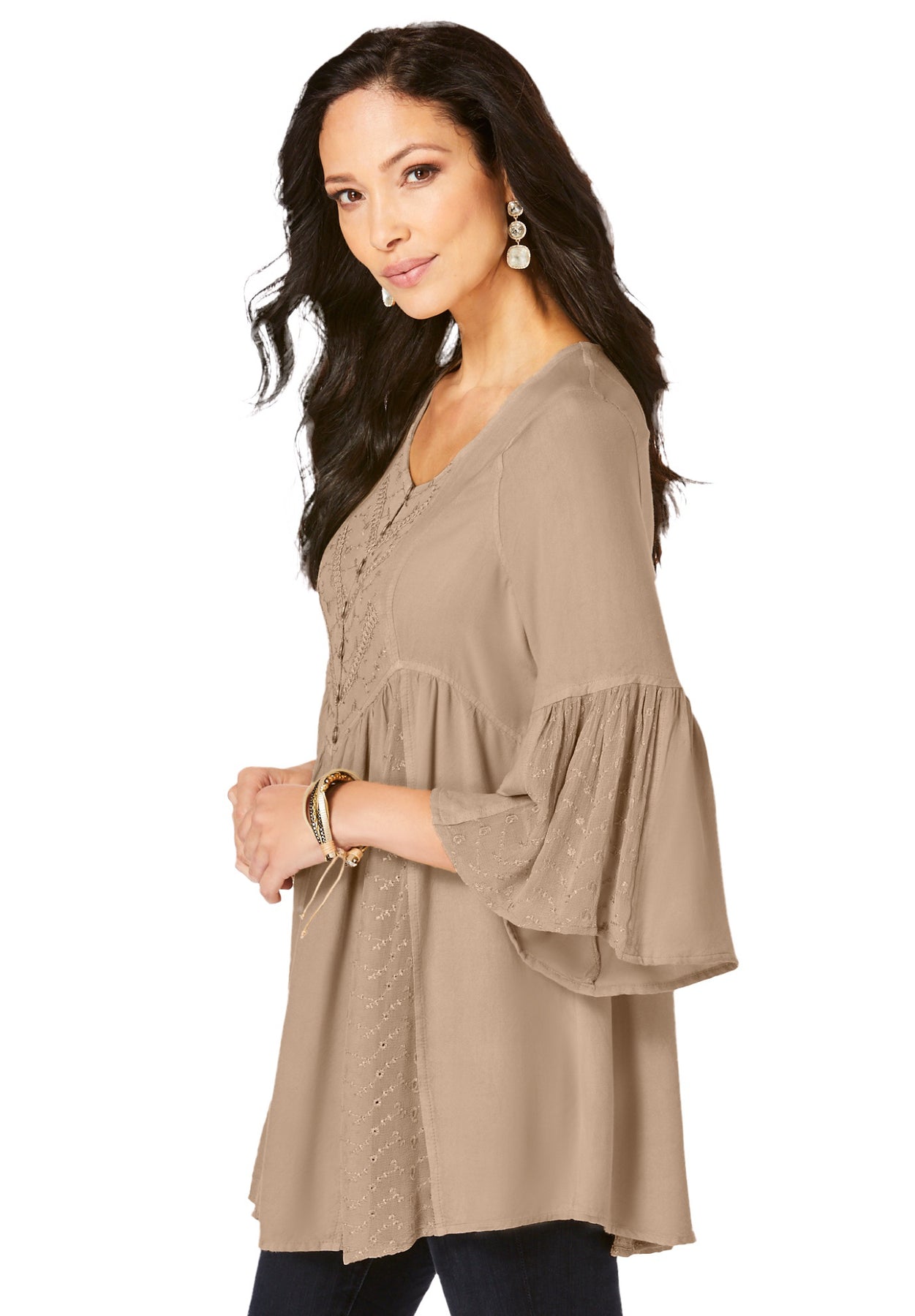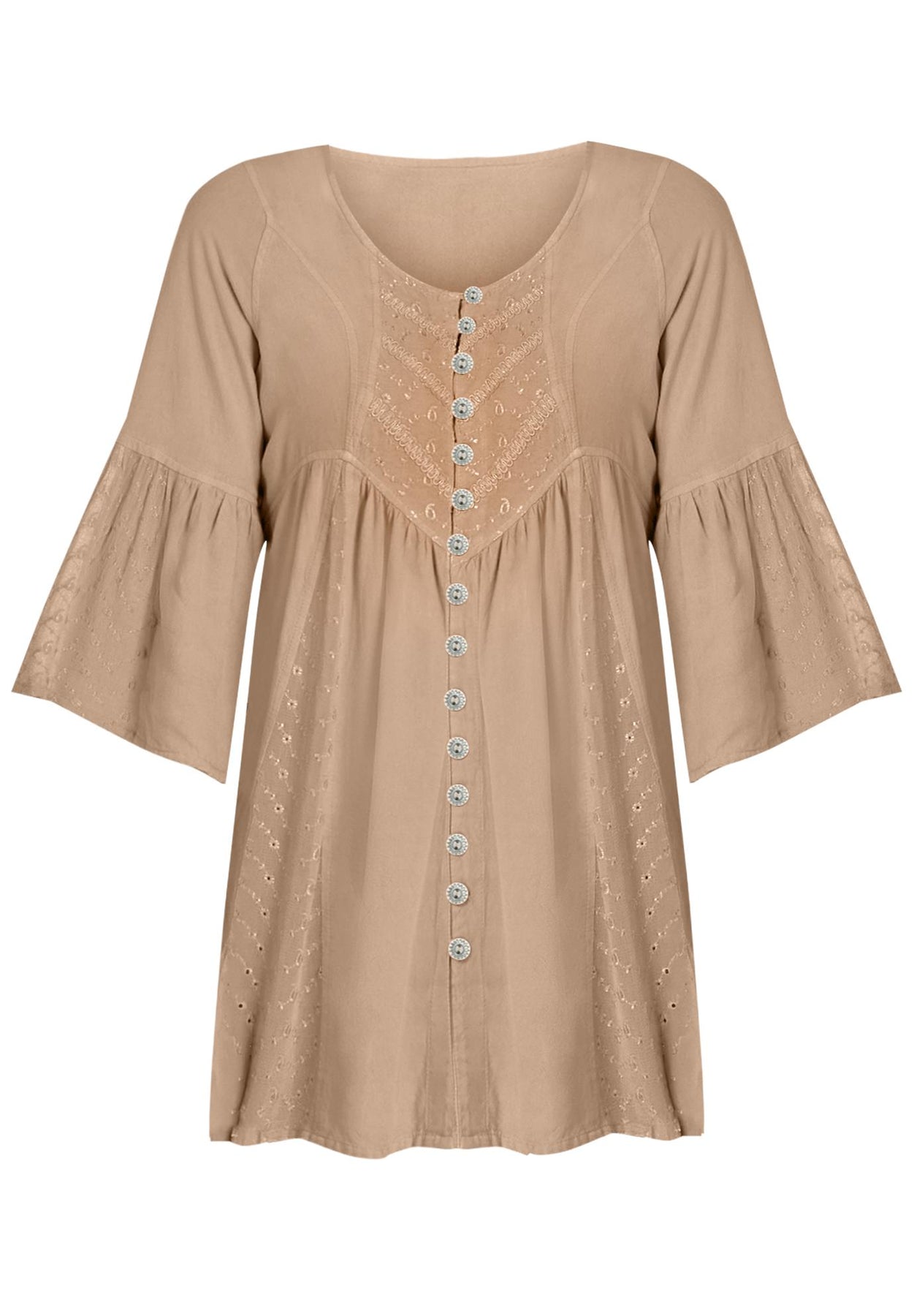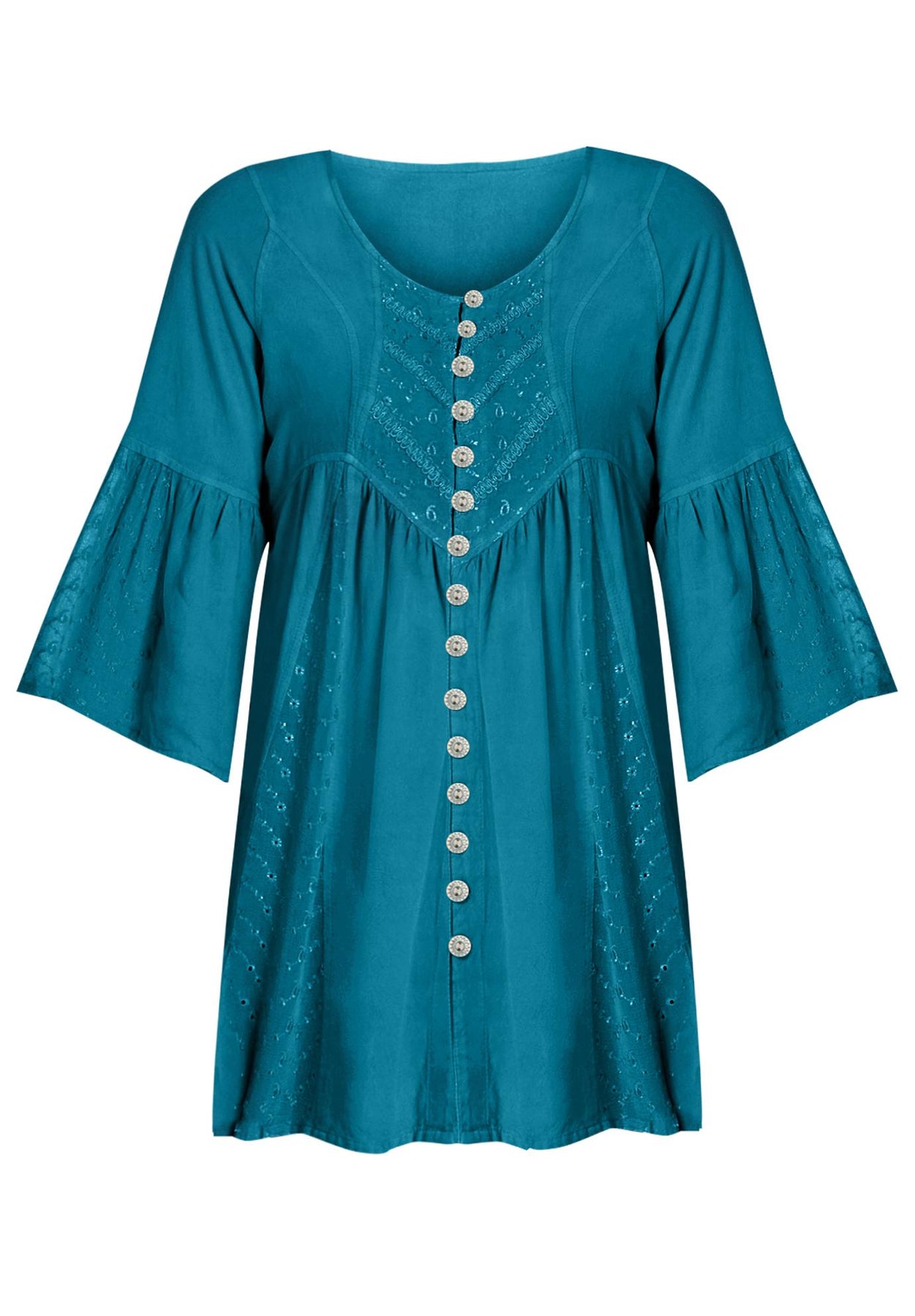 Part of our stunning Big Shirt collection, this style is designed with delicate embroidery along the front and back, and constructed with pretty princess seams. Finished with a special dye to give it an acid-washed look. Faux button-down front. A-line silhouette.