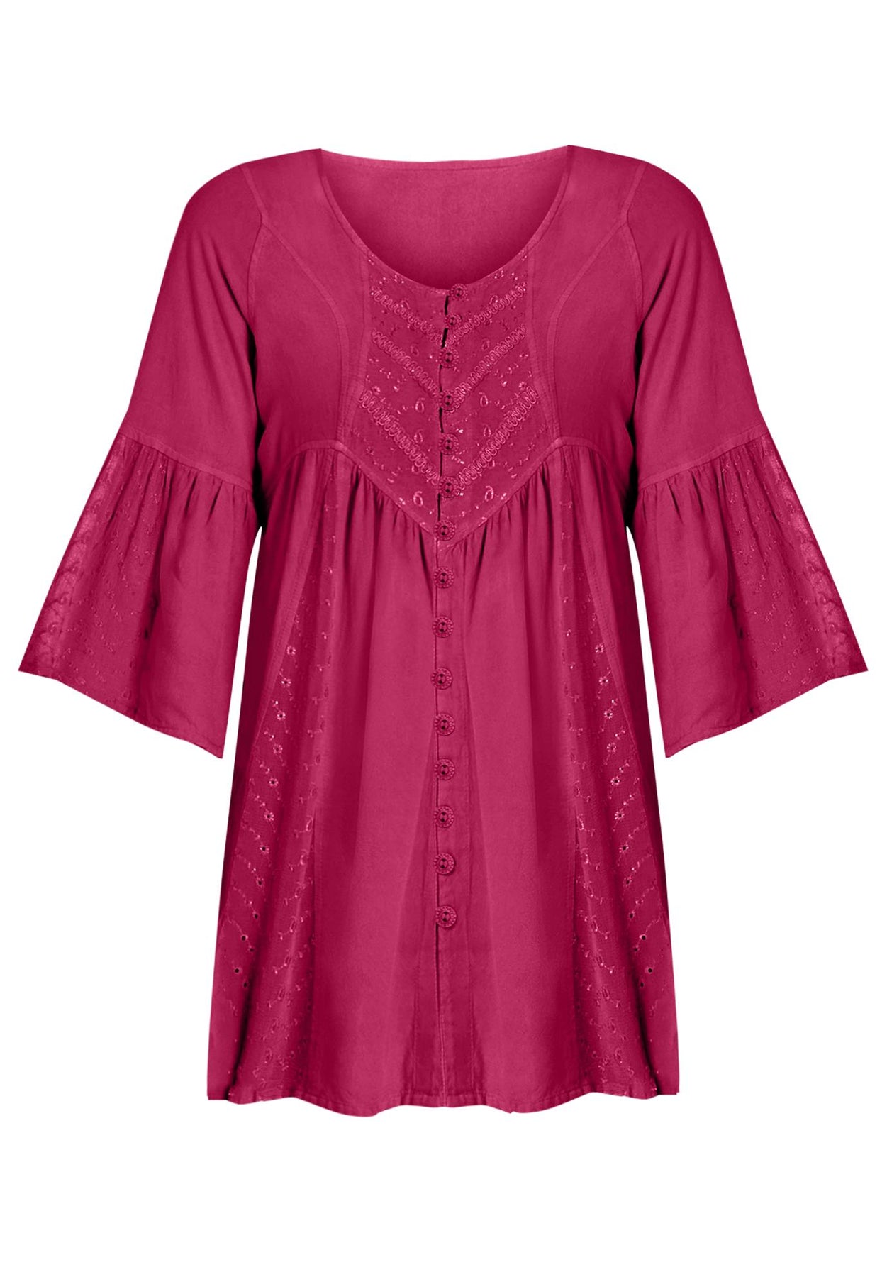 Part of our stunning Big Shirt collection, this style is designed with delicate embroidery along the front and back, and constructed with pretty princess seams. Finished with a special dye to give it an acid-washed look. Faux button-down front. A-line silhouette.