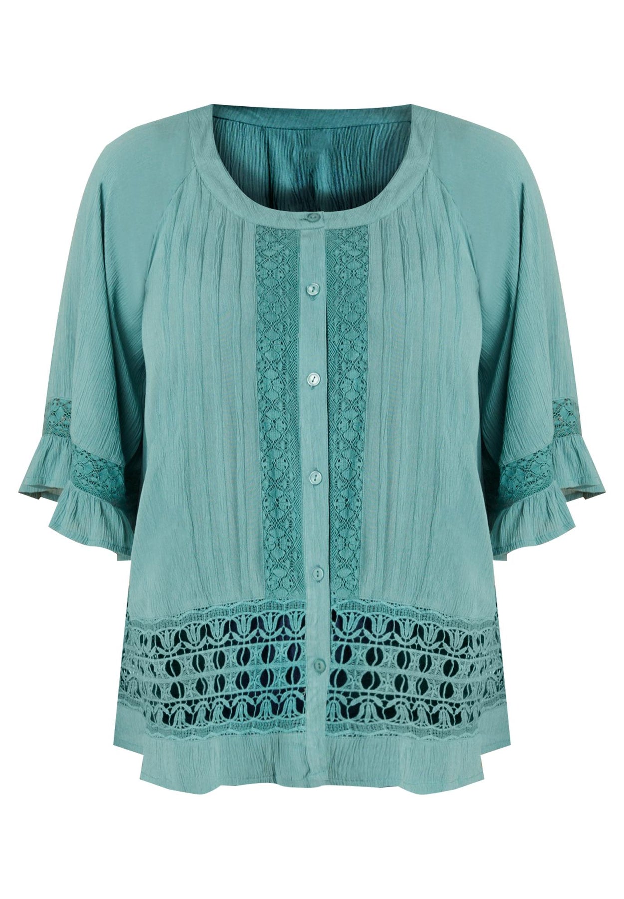 Embrace your bohemian side in this pretty lace-trimmed, button-front style. Finished with ruffles at the elbow-length raglan sleeves and lace trim at the hem, this top is perfect styled with your favorite jeans. Center-back pleats