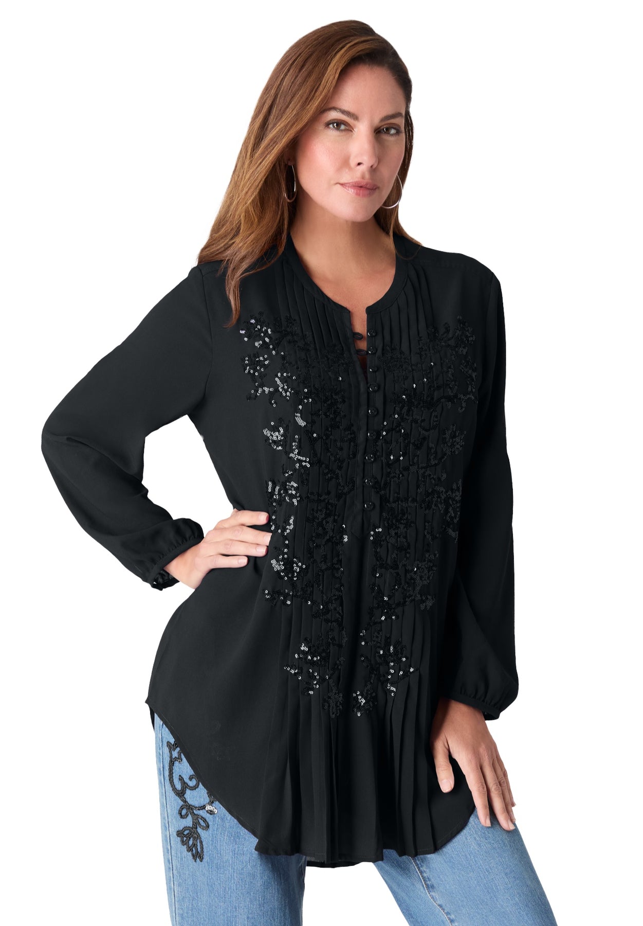 You'll dazzle in this sequin floral tunic that you can dress up or down. The flattering neckline and on-trend tunic length make this top a great addition to your closet. Relaxed fit, blouson sleeves, shirttail hem.