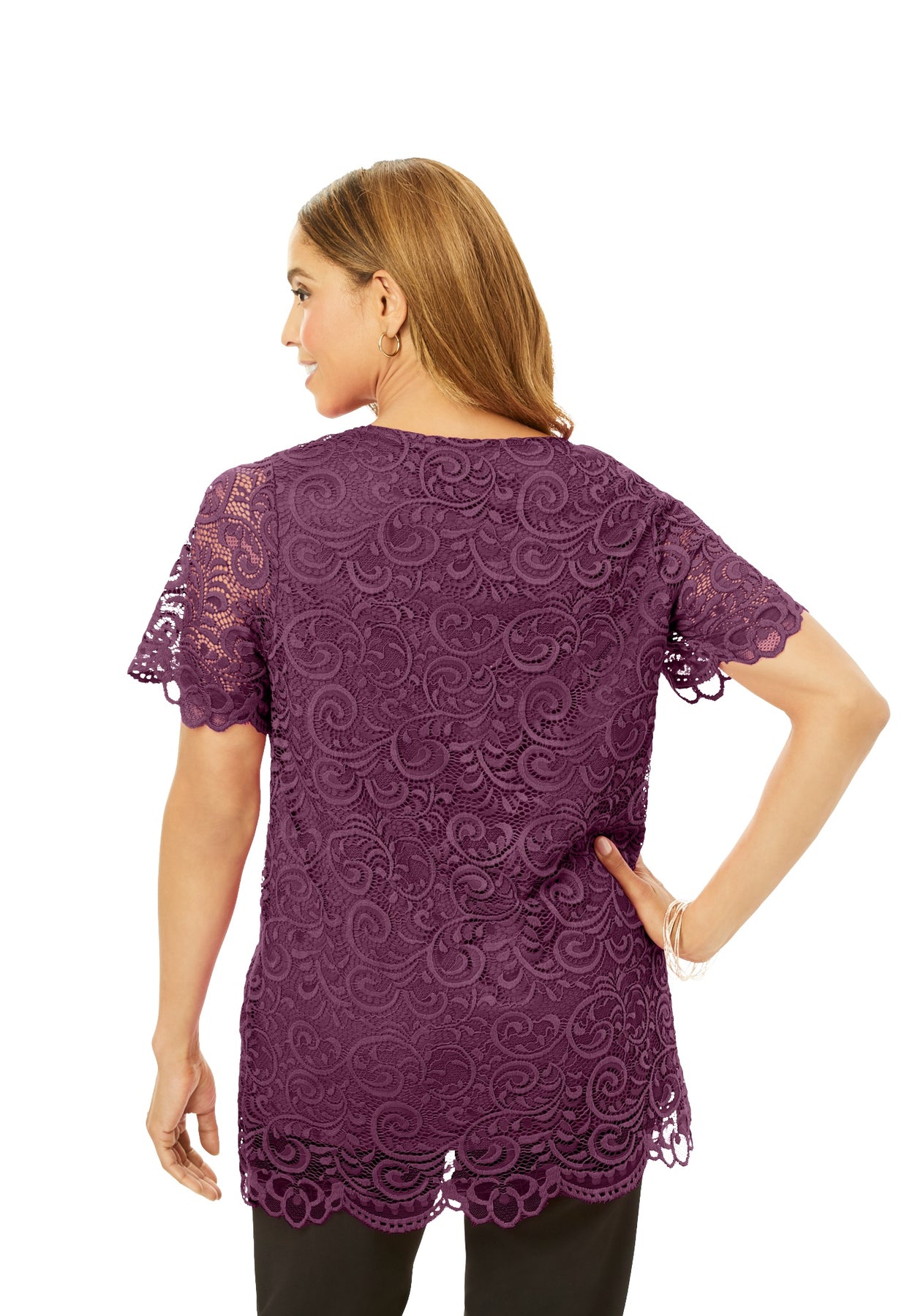 This feminine lace top will soon become your new go-to for effortless sunny-day style. The rounded neckline is perfectly proportioned to smartly conceal bra straps and the longer, tunic length provides added coverage that will flawlessly flatter every figure.